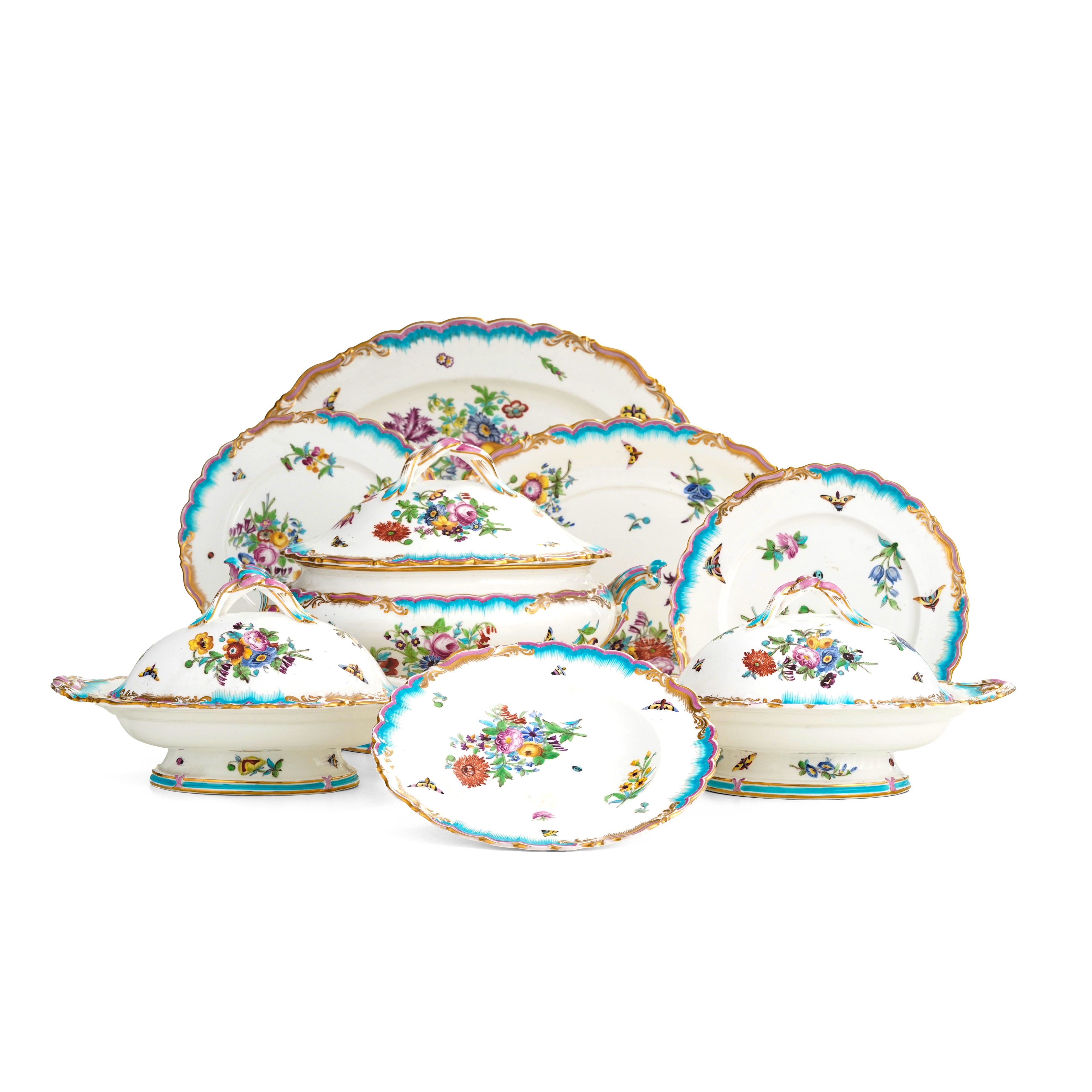 Lo stile di queste porcellane è fortemente influenzato dalla manifattura reale francese di Sèvres. Il motivo decorativo ricorda quello detto "Chou" del XVIII secolo, in particolare per il blu turchese dipinto a pettine. La delicata decorazione policroma è costituita da ramoscelli e bouquet di fiori estivi e insetti sparsi