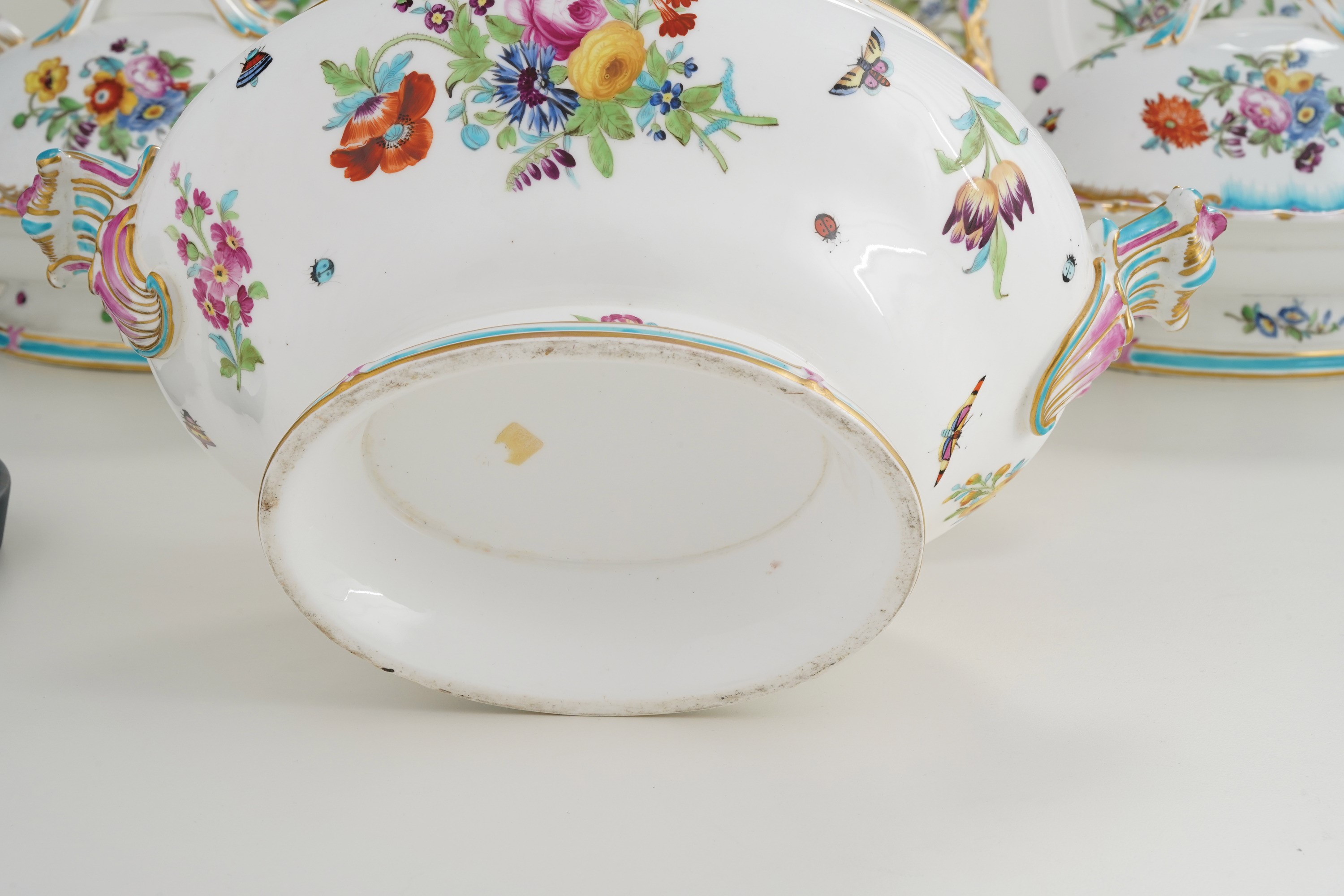 Porcellana. Marca: assente. Conservazione: ottima; leggera felatura al bordo superiore della zuppiera; qualche insignificante segno di usura sull'oro