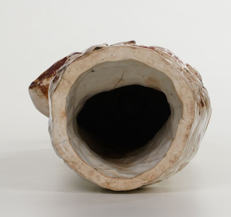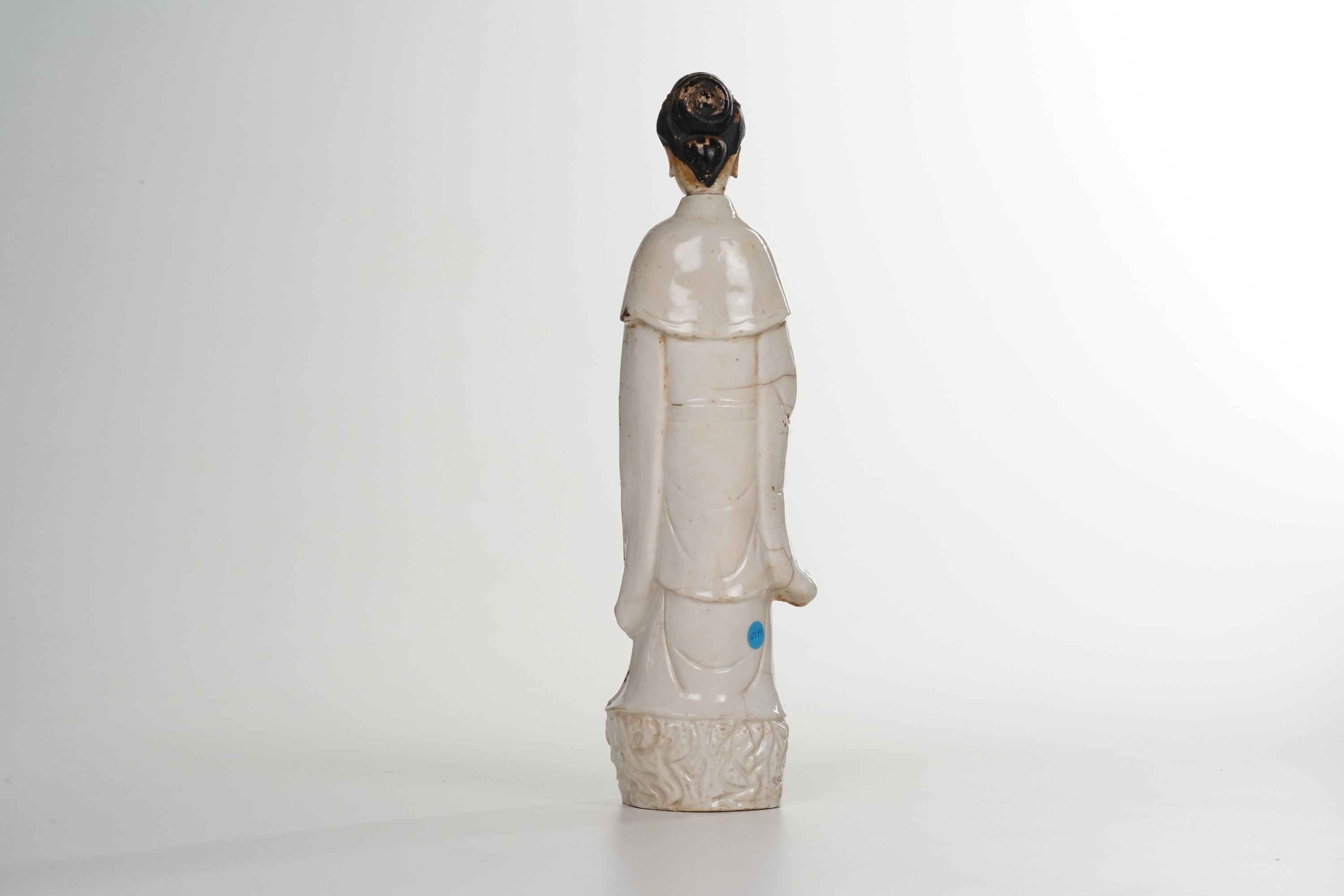 Porcellana “Blanc de Chine”. Marca: assente. Altezza cm 47,5. Conservazione: rotture nella parte superiore del busto, sulle spalle e sul colletto riprese in restauro; usure alla policromia e all’oro.