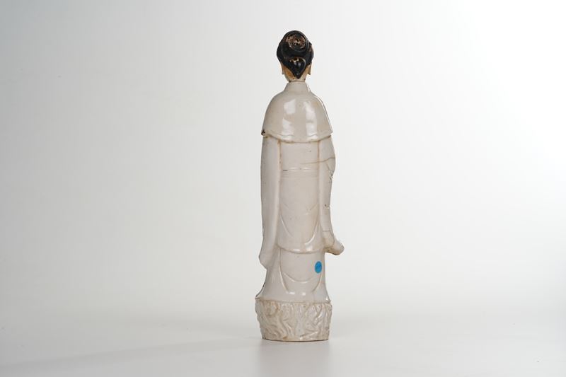 La figurina di Guanyin nasce in porcellana bianca in Cina per poi essere decorata in Europa a freddo in rosso, verde, nero e oro nel XVIII secolo, forse ad Ansbach, in Germania