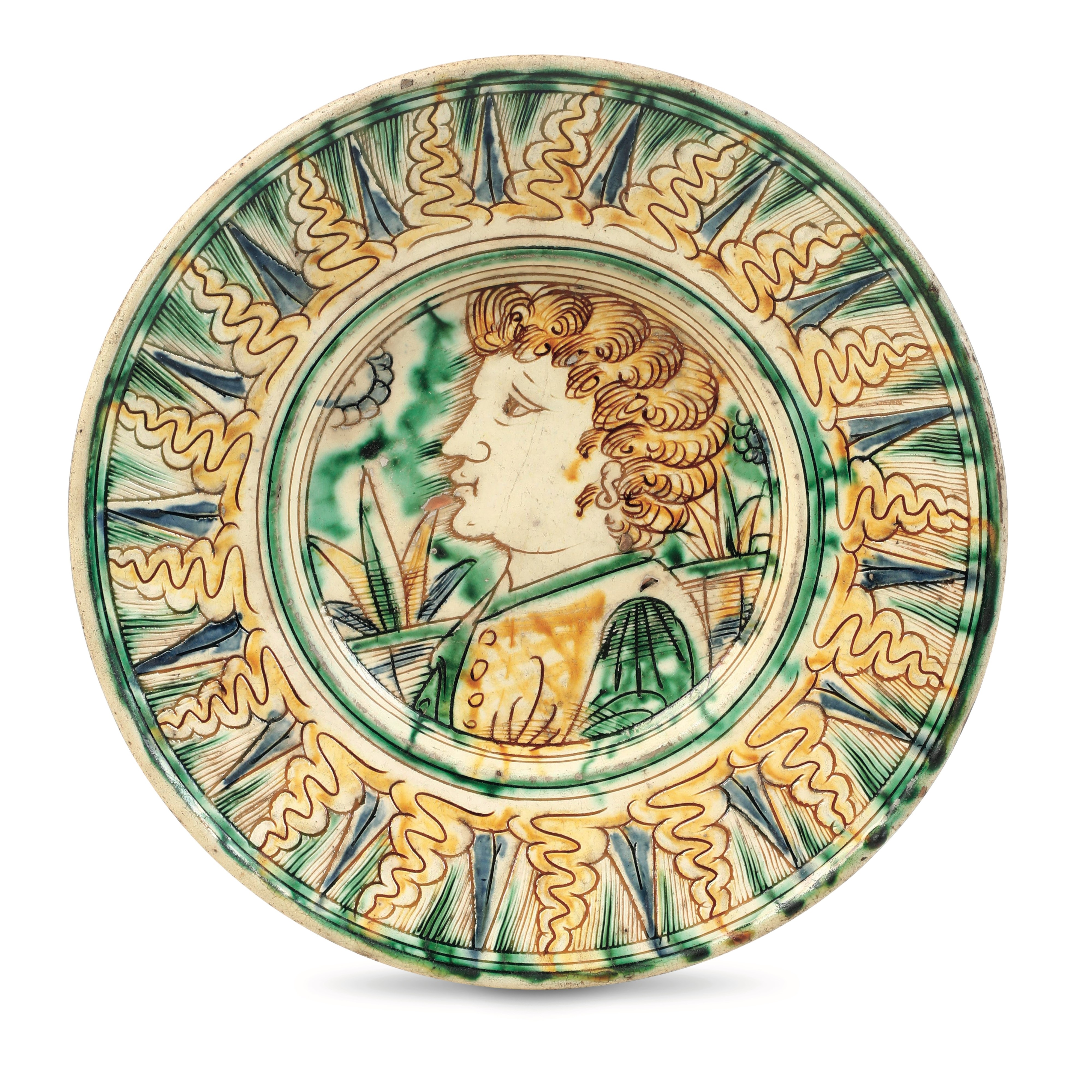 Il piatto dal bordo svasato, è decorato al centro con un ritratto di profilo di un giovane, tra motivi vegetali, incorniciato da una fascia sulla tesa a raggi serpentiformi, nei toni del crema, dell'ocra, del verde e del blu