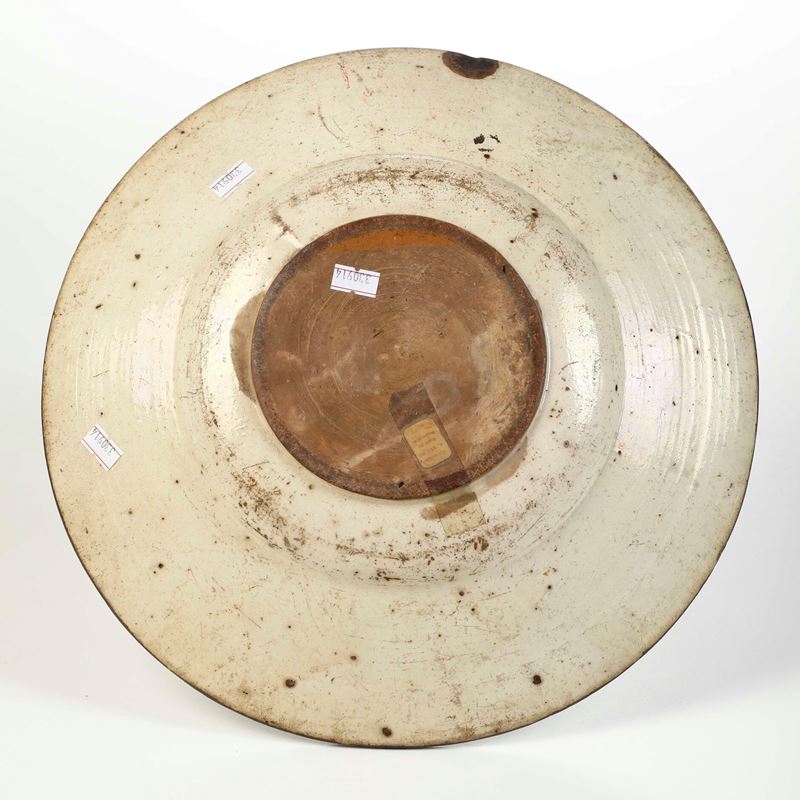 Terracotta ingobbiata, invetriata e graffita. Diametro cm 34,5. Conservazione: insignificanti usure dello smalto ai bordi; sbeccatura sul verso al bordo. Provenienza: A Vecht, Amsterdam