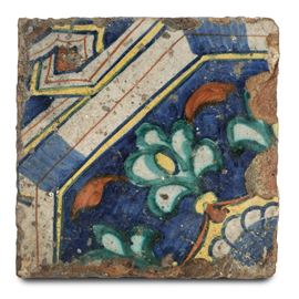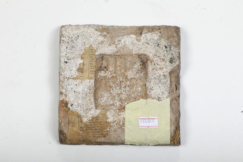 Terracotta smaltata. Dimensioni: spessore cm 2,2; cm 14x14. Conservazione: buona; qualche sbeccatura