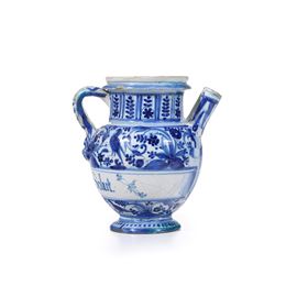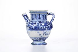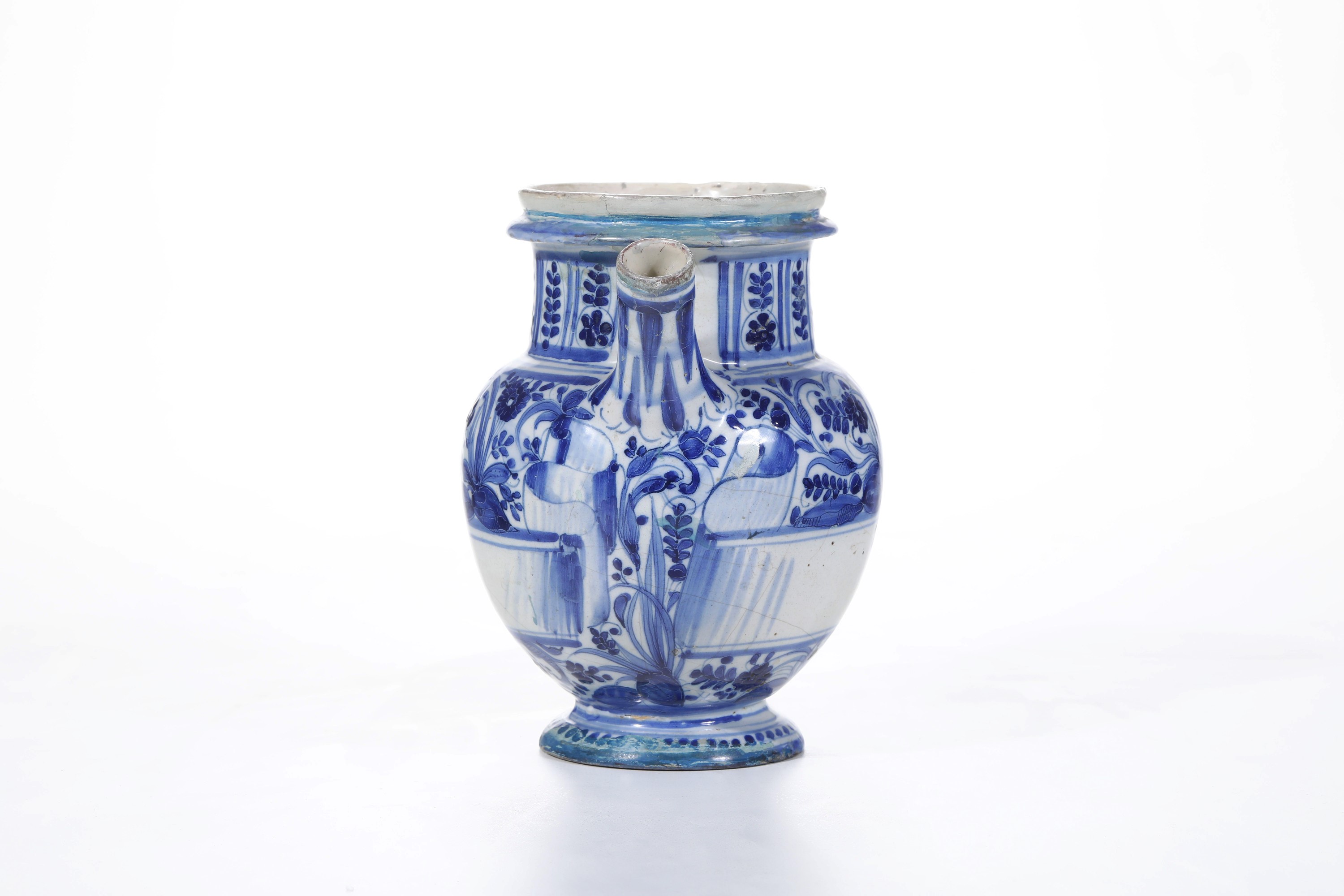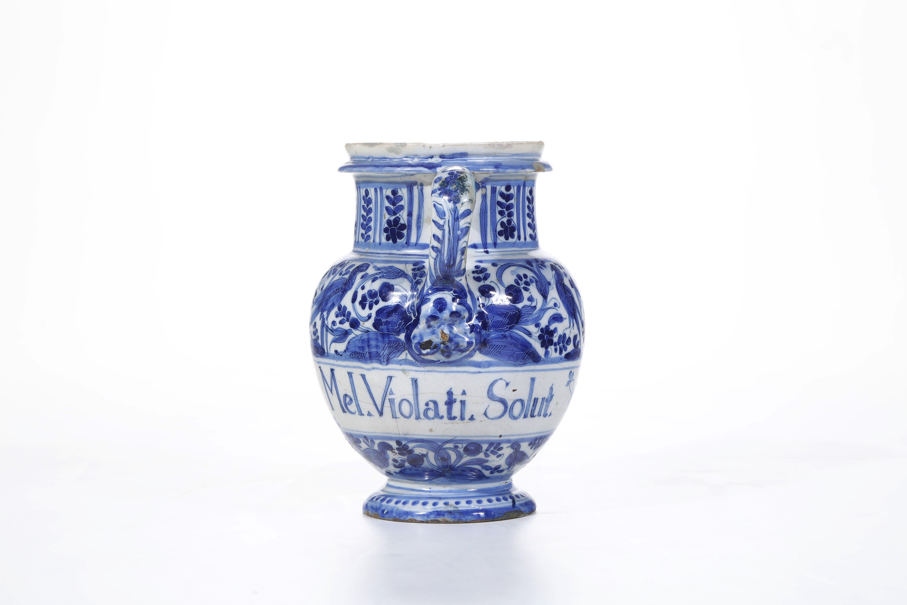 Orciolo dal corpo ovoidale, lungo collo, beccuccio a cannello e ansa desinente a mascherone. E’ decorato in monocromia blu di cobalto con il motivo “orientalizzante” naturalistico con ciuffi fogliati e fiori, animato da due uccelli. Al centro taglia l’ornato la fascia apotecaria con la scritta