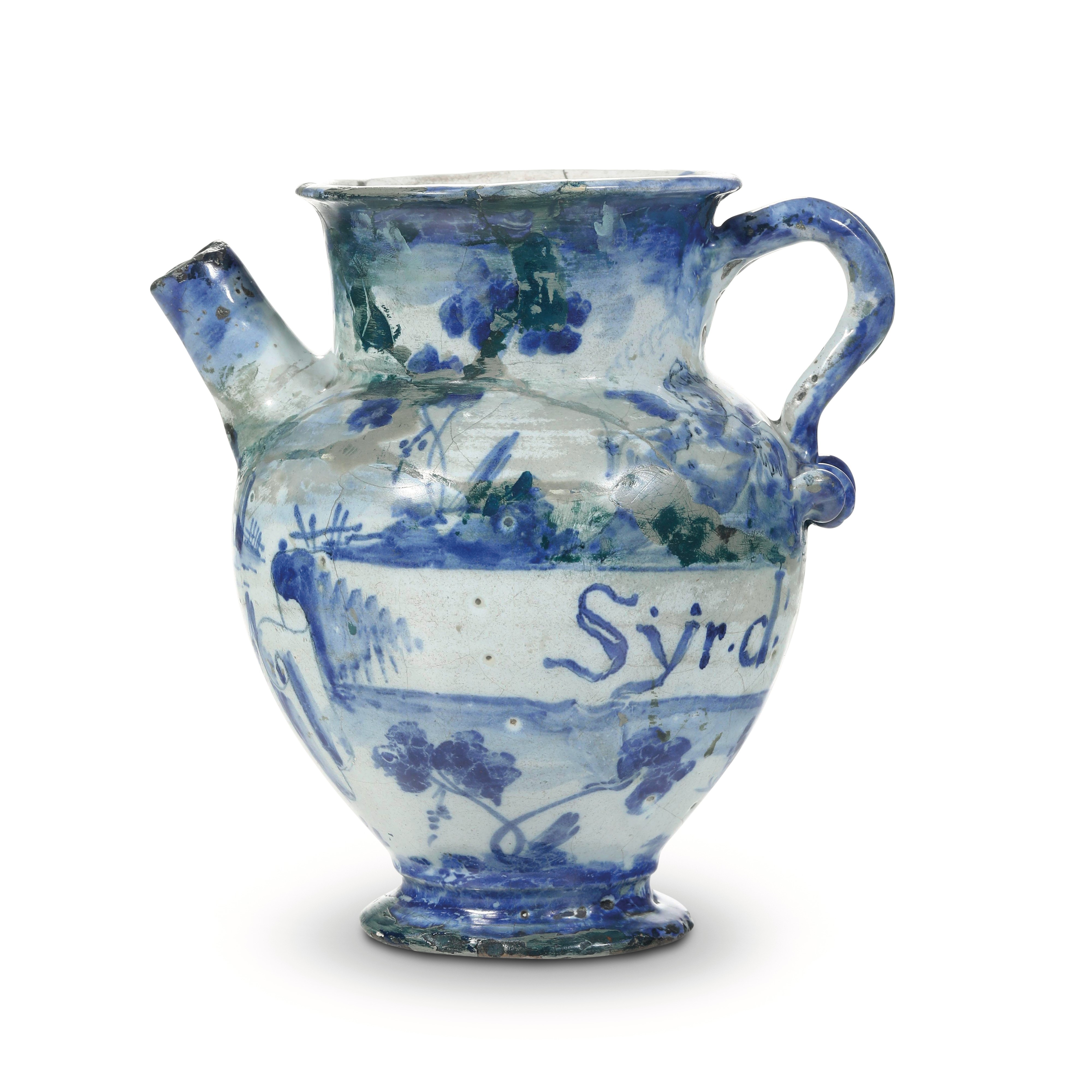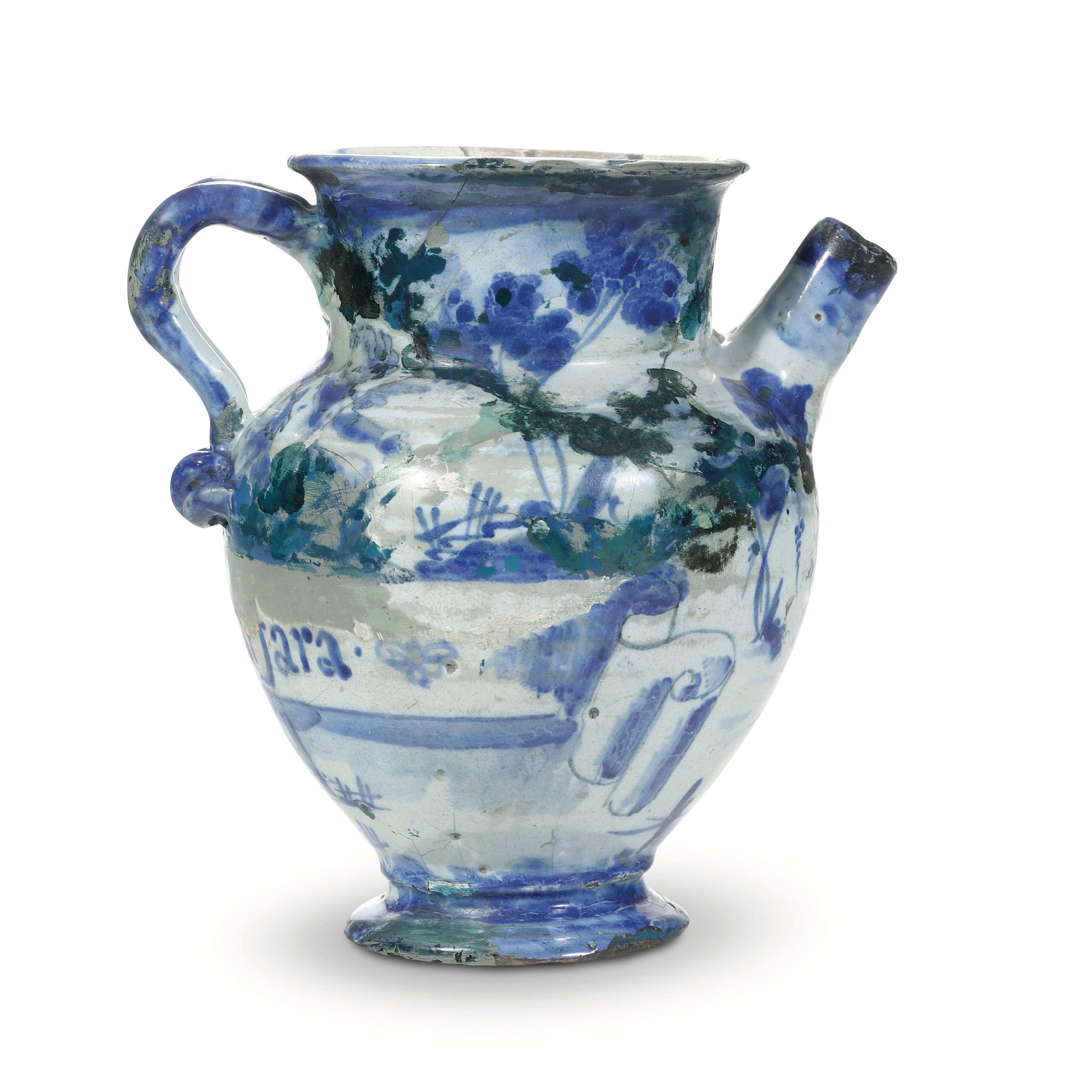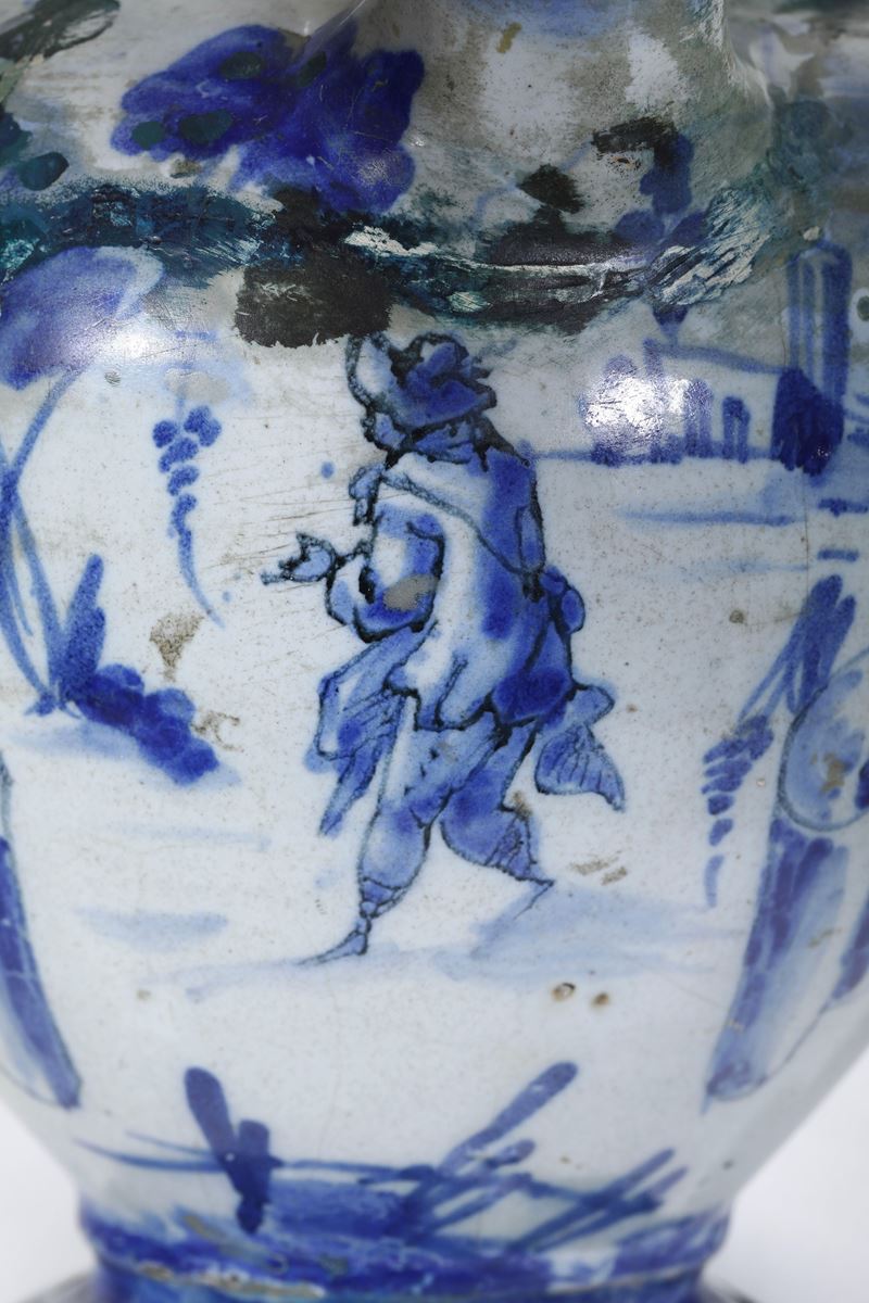 Corpo ovoidale, versatoio a cannello e ansa a doppio cordolo. La decorazione in monocromia blu di cobalto è a paesaggio, accanto all’ansa due putti alati sovrastano la fascia apotecaria