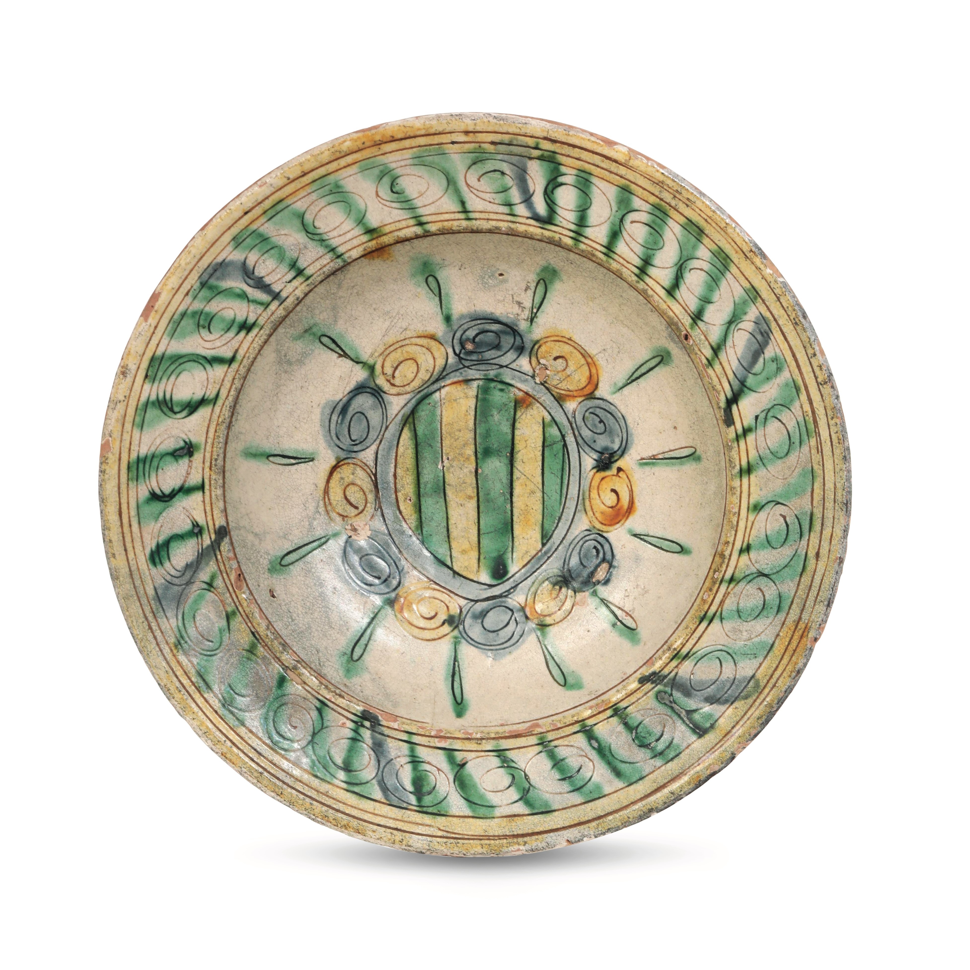 Terracotta ingobbiata, invetriata e graffita. Dimensioni: altezza cm 7 circa; diametro cm 26,2. Conservazione: ottima; insignificanti sbeccature e cadute di smalto ai bordi