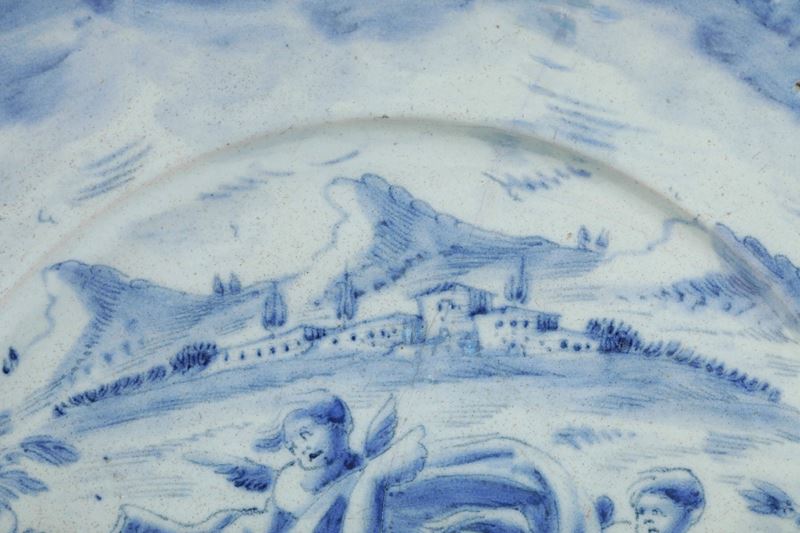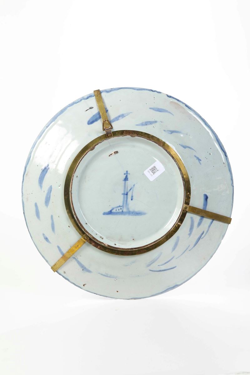 Maiolica. Marca: Lanterna in blu. Diametro cm 44. Conservazione: felatura alle ore 12 che scende verso il centro del cavetto; piccole sbeccature e cadute di smalto di cui un paio restaurate