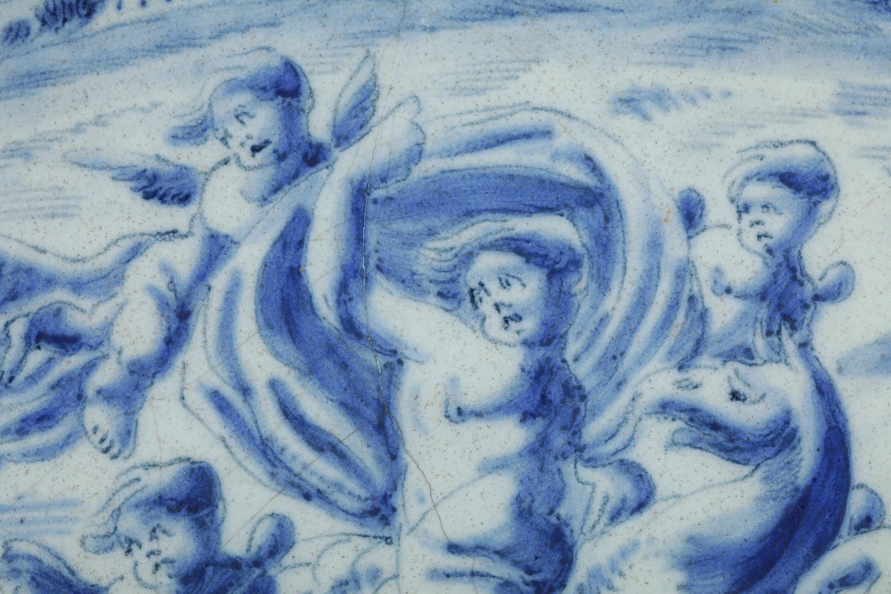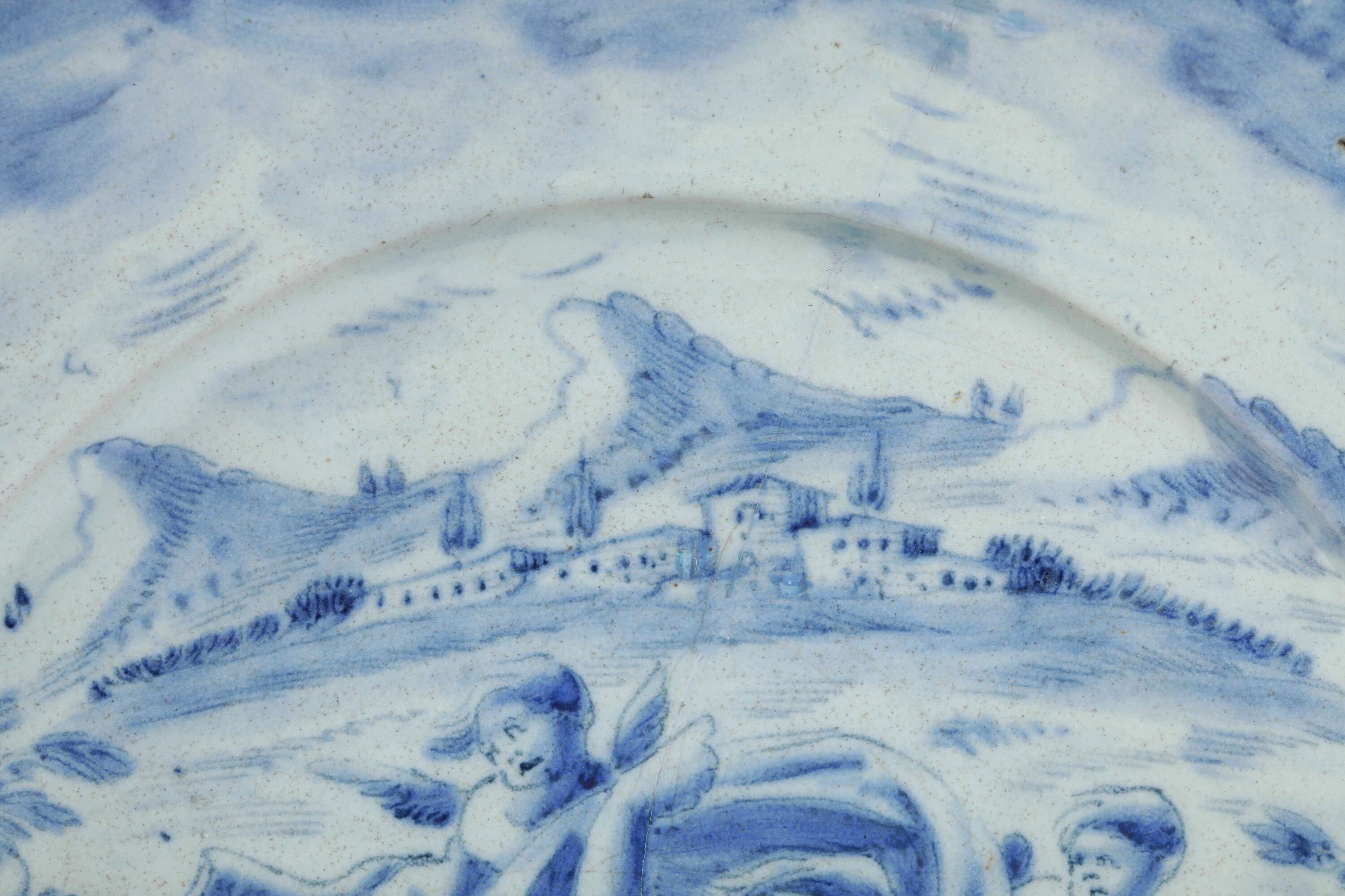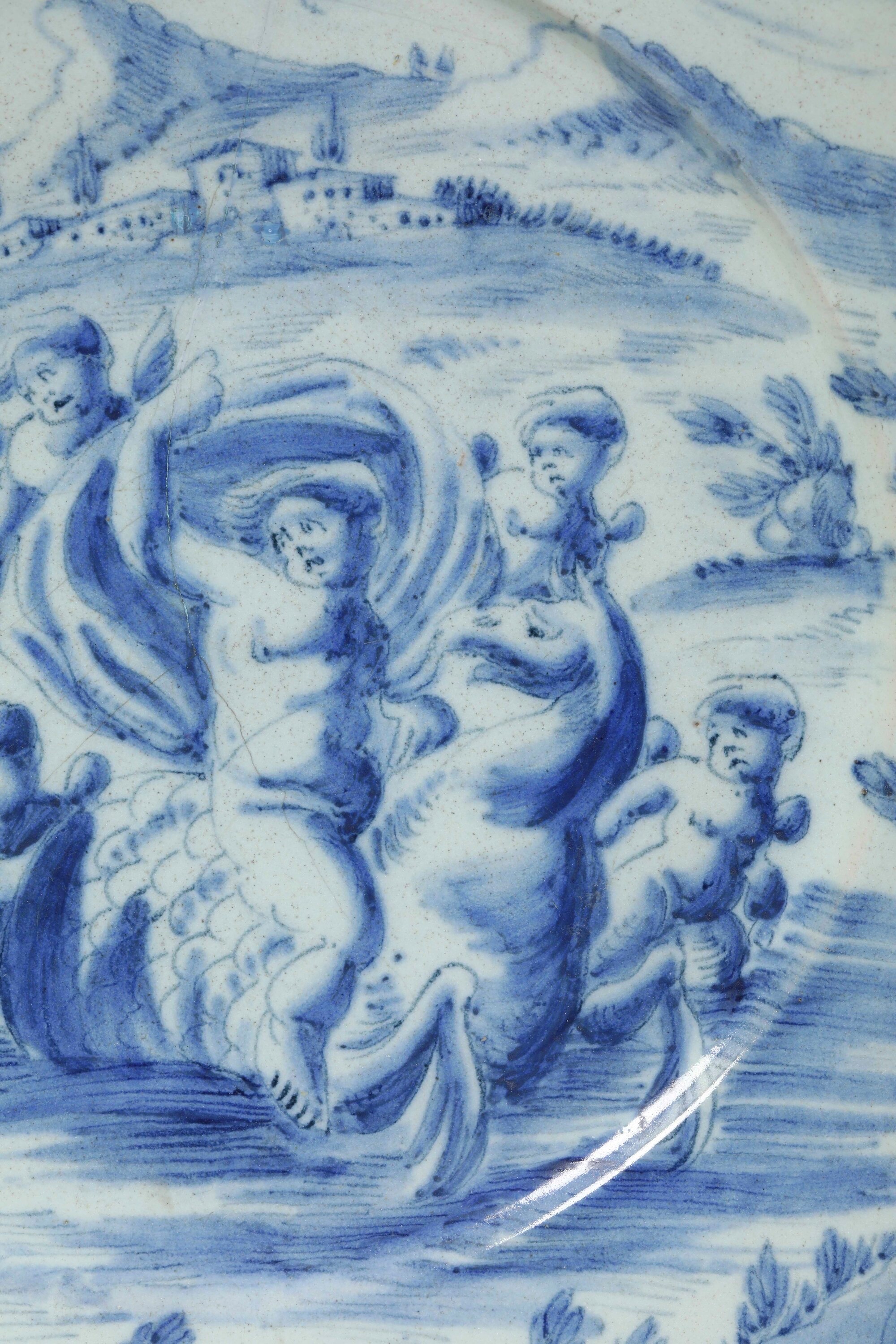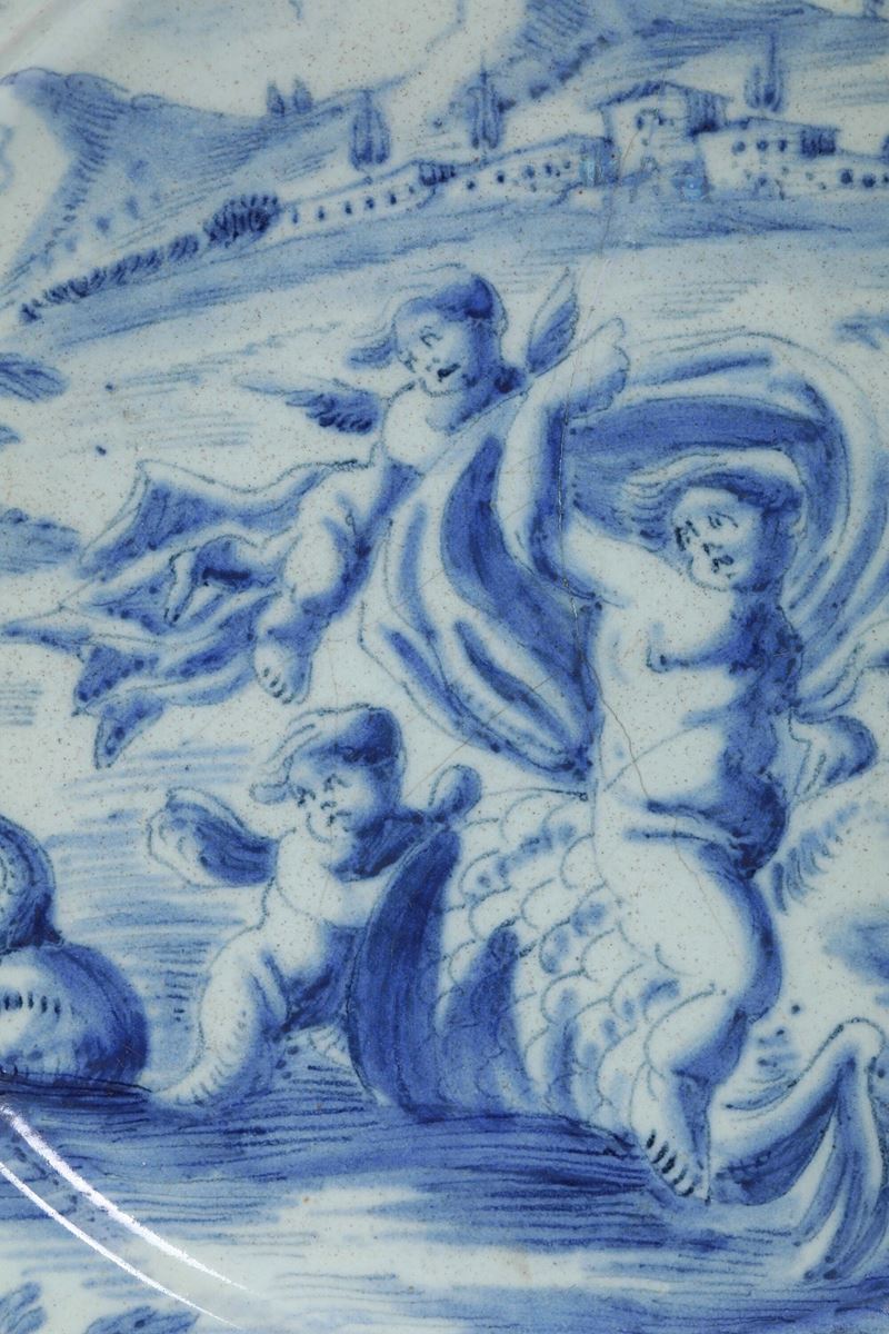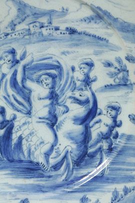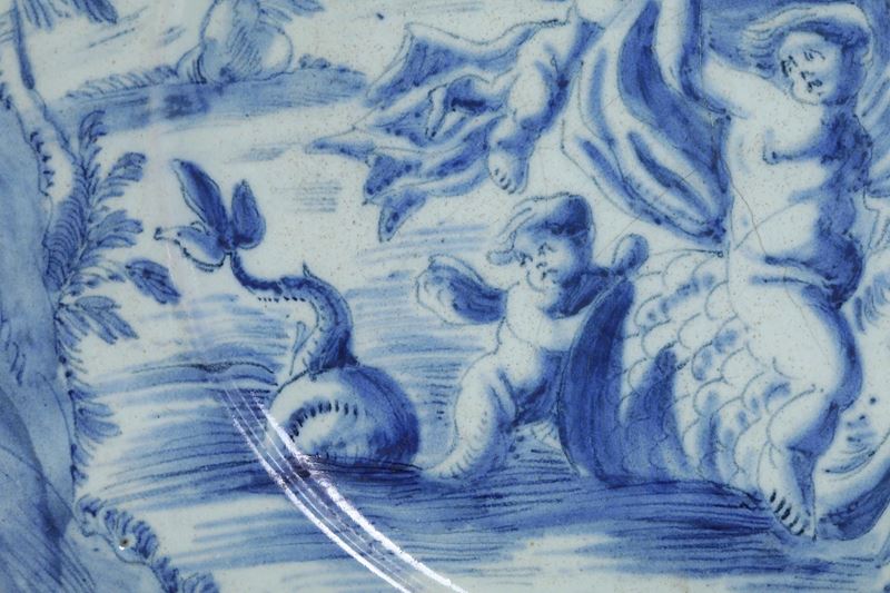 La decorazione si estende all’intera superficie anteriore, eseguita in monocromia blu sul fondo di colore azzurro a tenue sfumatura di verde. Il soggetto istoriato appartiene a pieno titolo alla “scenografia barocca”: rappresenta una vigorosa figura maschile che procede sulla superficie dell’acqua in groppa all’animale di stirpe ibrida parente dei grifoni, avendo intorno quattro putti alati, mentre lo spirare del vento gonfia il drappo nel quale si avvolge. La scena ha luogo oltre la cortina di terreno erboso estesa lungo la metà inferiore del cerchio della tesa, inserita nel vasto paesaggio che dalla riva giunge agli edifici posti in collina e al successivo profilo dei monti, al di sopra dei quali dal colmo superiore del cerchio della tesa incombono le nubi.