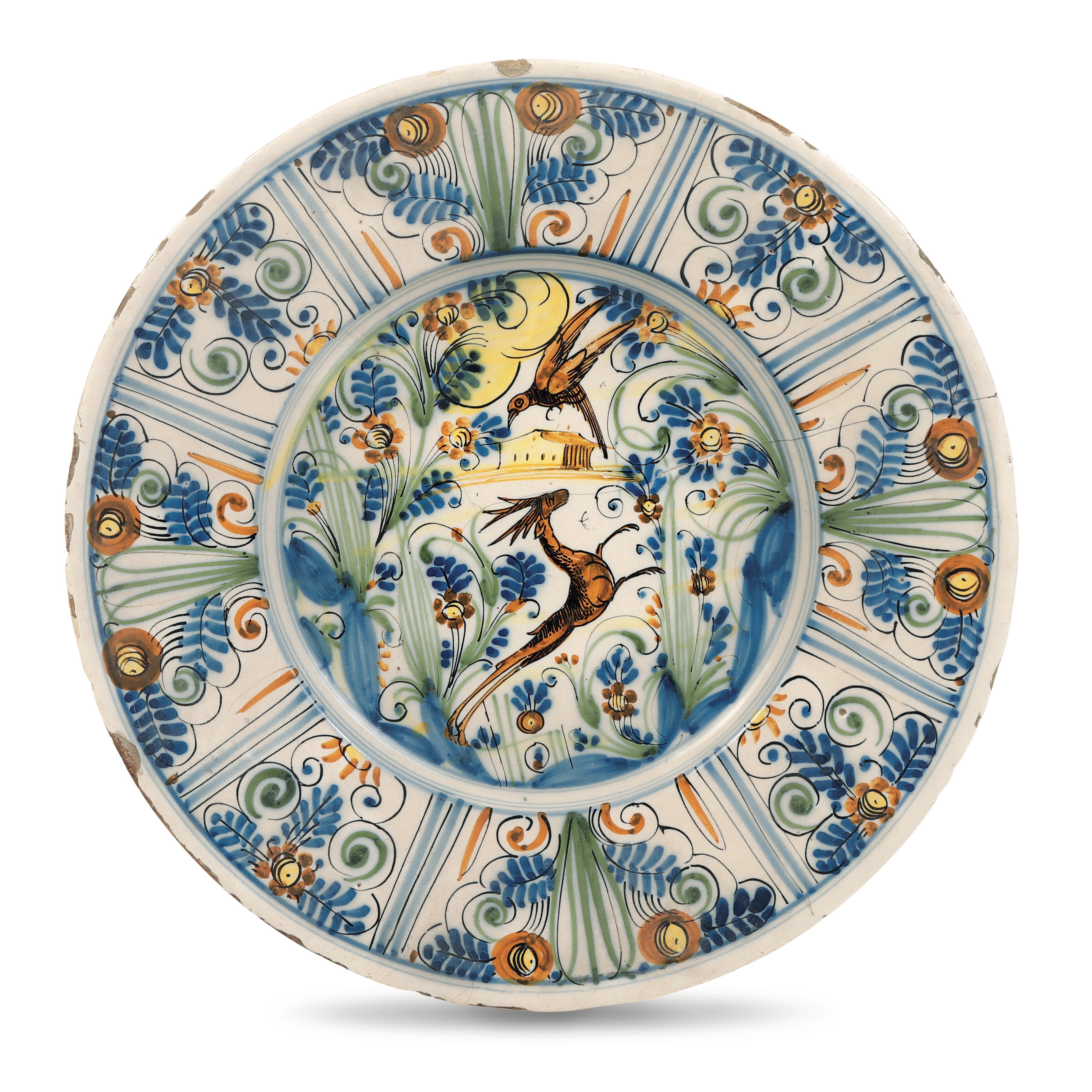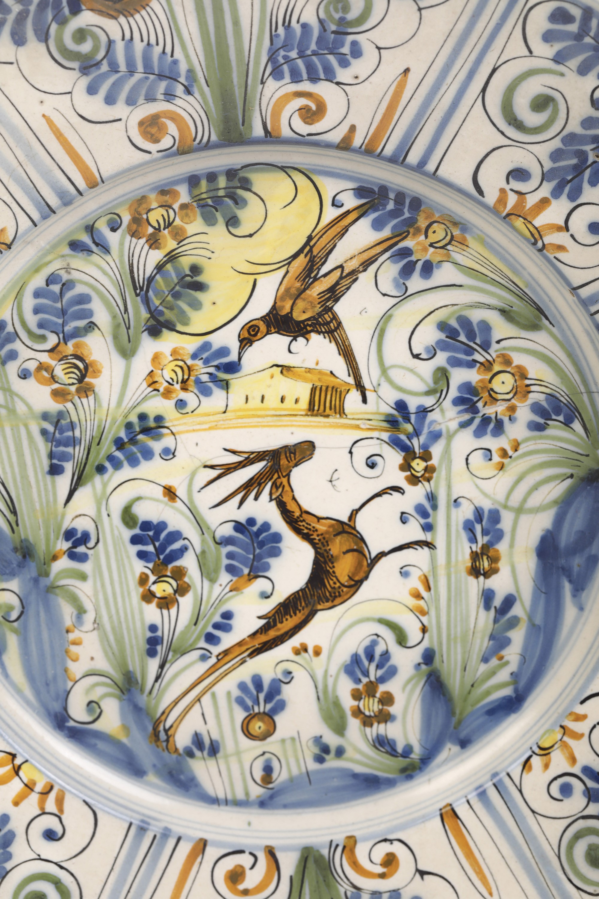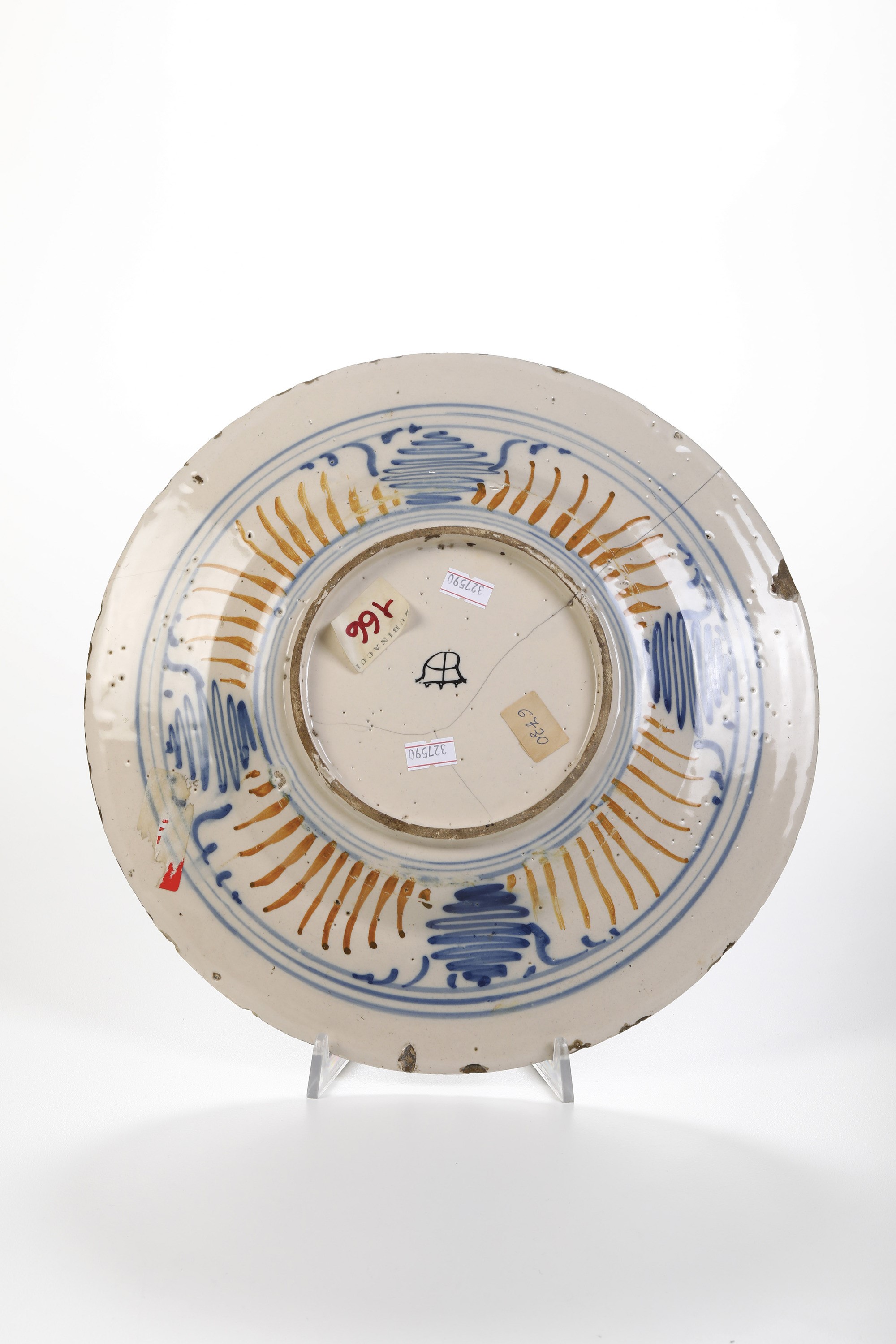 Maiolica policroma a gran fuoco. Marca: Stemma di Savona in nero. Diametro cm 32,2. Conservazione: sbeccature e salti di smalto al bordo; felatura che parte dal bordo alle ore 14,30 e scende ad invadere il cavetto