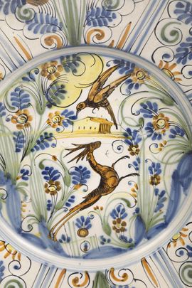 Il piatto dalla larga tesa e piede ad anello, è dipinto, in stile “calligrafico naturalistico”, in blu, verde, giallo, ocra e manganese. Il cavetto ospita un’elegante antilope, un uccello in volo tra piante lacustri e un edificio; la tesa è suddivisa a quartieri. Sul verso, motivo stilizzato realizzato con veloci pennellate di colore blu e ocra