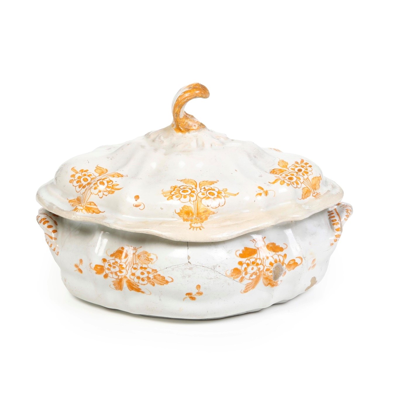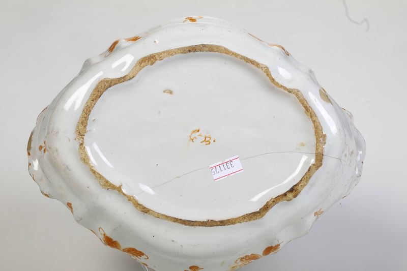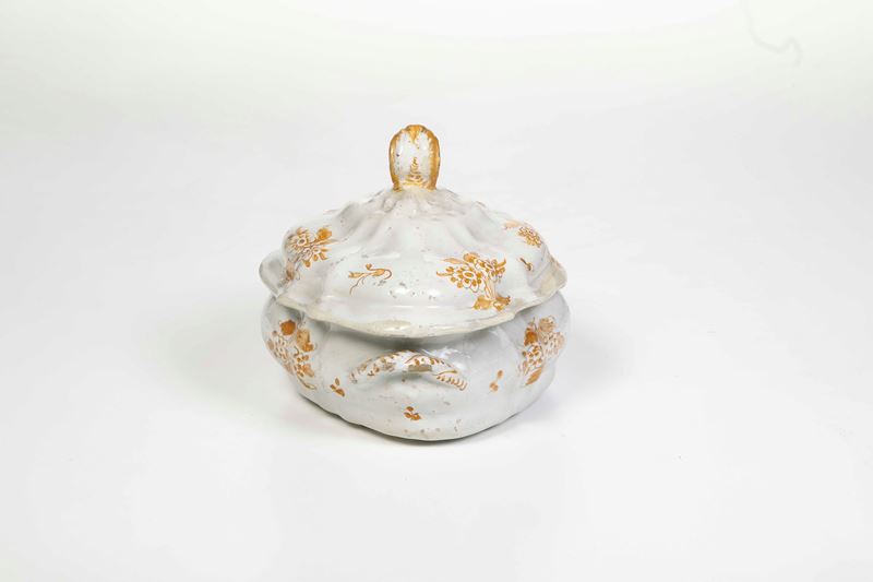 Maiolica. Marca: “G.B.” in ocra. Dimensioni: altezza cm 16,8; cm 24,5x18,7. Conservazione: vecchi restauri su parte del bordo del coperchio, presa incollata; corpo con felature e piccole sbeccature, salti di smalto