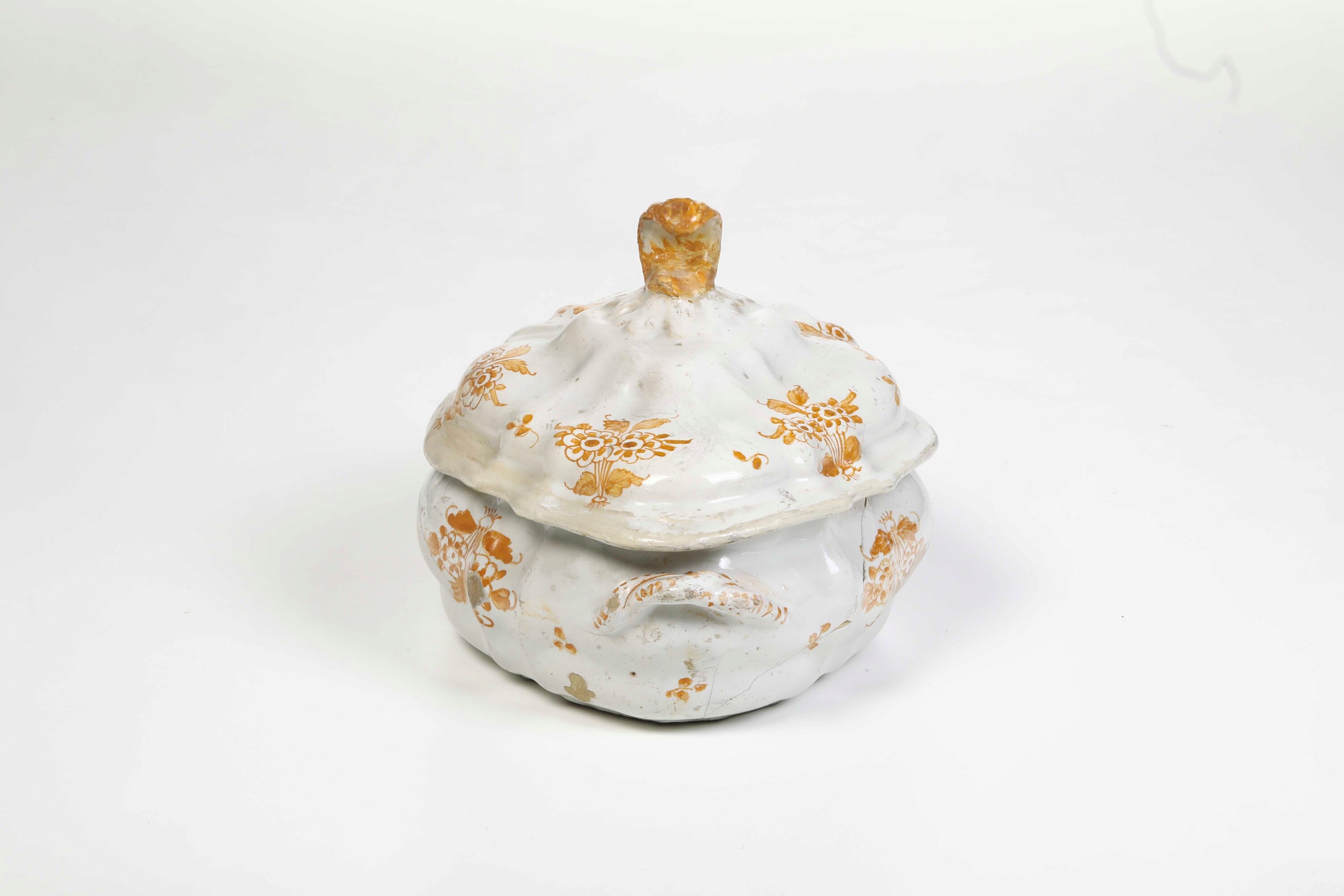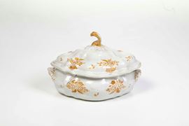 La zuppiera dalla forma ovale e il suo coperchio a cuspide presentano il profilo costolato ottenuto a stampo. La decorazione, in monocromia ocra, è costituita da mazzetti di fiori disposti simmetricamente, ispirati alle maioliche francesi di Moustier