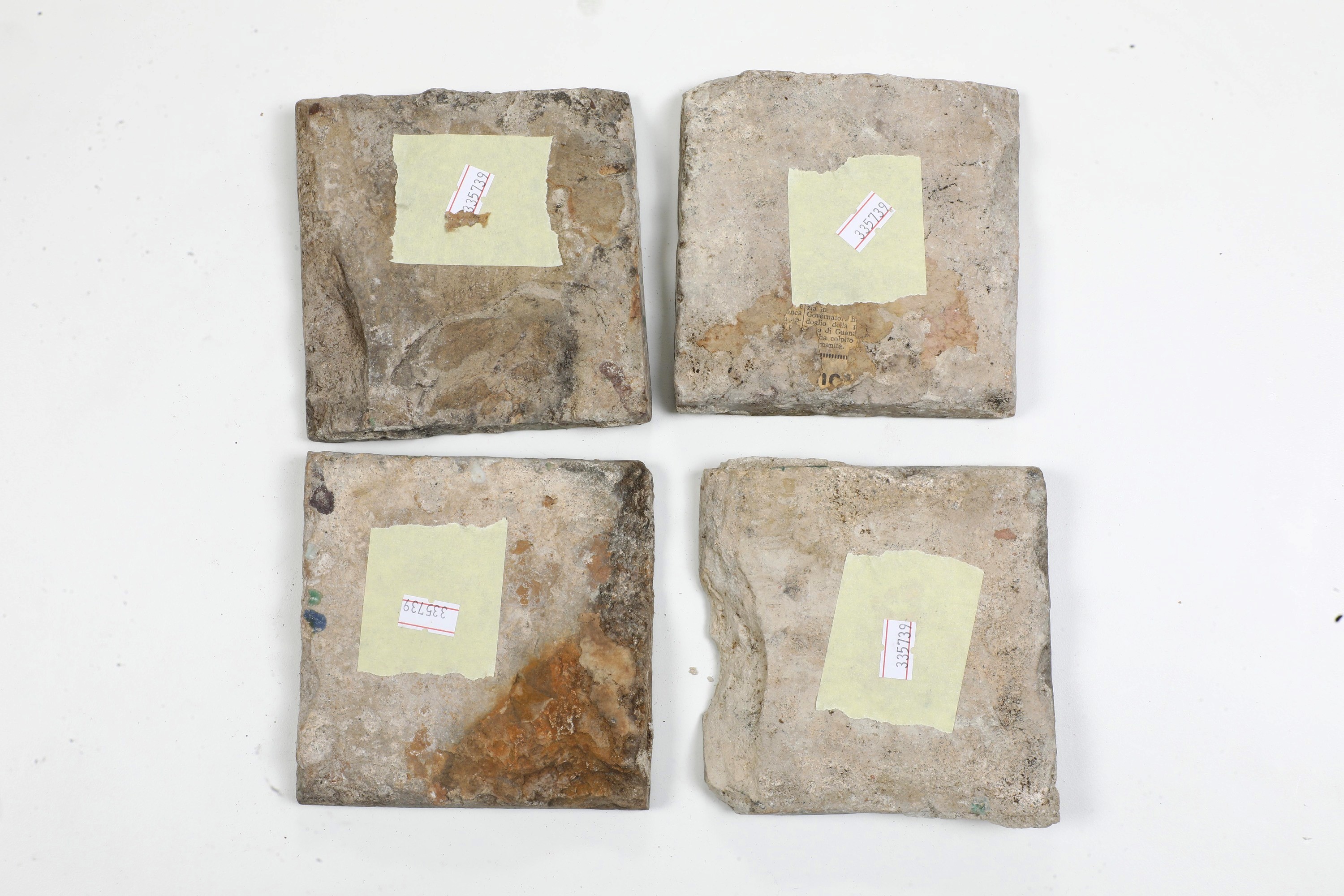 Terracotta smaltata. Dimensioni: spessore cm 2; cm 13,1x13,1 circa. Conservazione: salti di smalto e qualche sbeccatura ai bordi