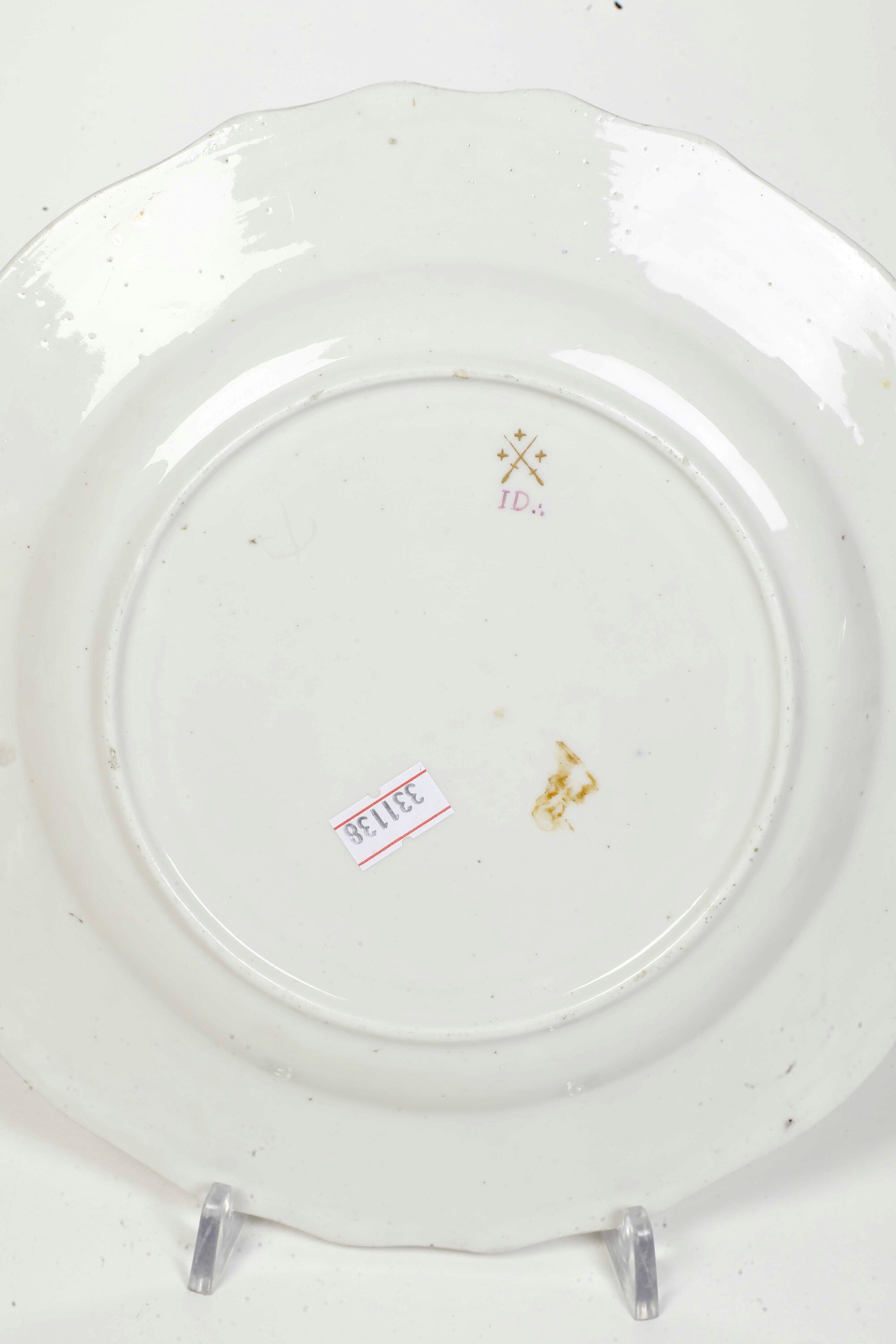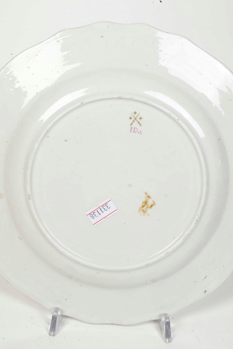 Porcellana. Marca: spade incrociate con 3 crocette in oro; lettere "ID" con 3 puntini in porpora. Diametro cm 23,3. Conservazione: ottima