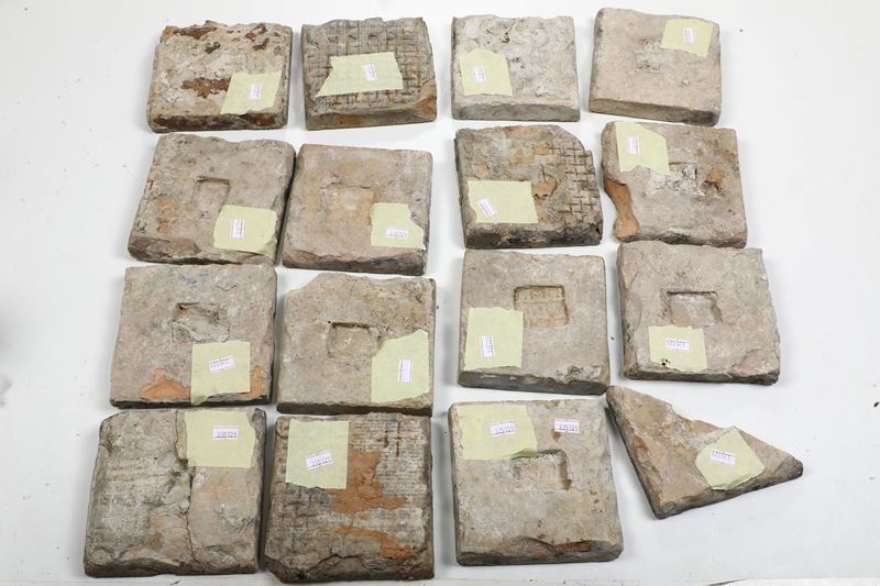 Terracotta smaltata. Dimensioni: spessore cm 2,3; cm 13,8x13,8. Conservazione: qualche mancanza; sbeccature e salti di smalto; una mattonella rotta in due frammenti incollata