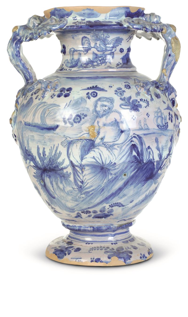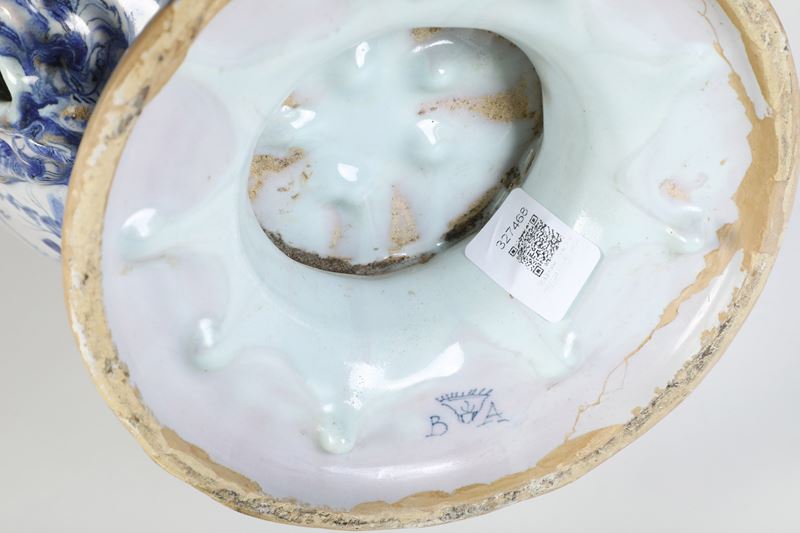 Maiolica. Marca: stemma di Savona con lettere “BA” in blu. Altezza cm 44. Conservazione: buona; bordo superiore e inferiore in parte integrati con finto biscotto; sbeccature e cadute di smalto