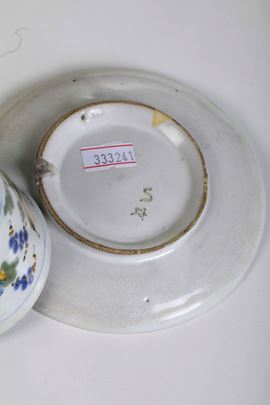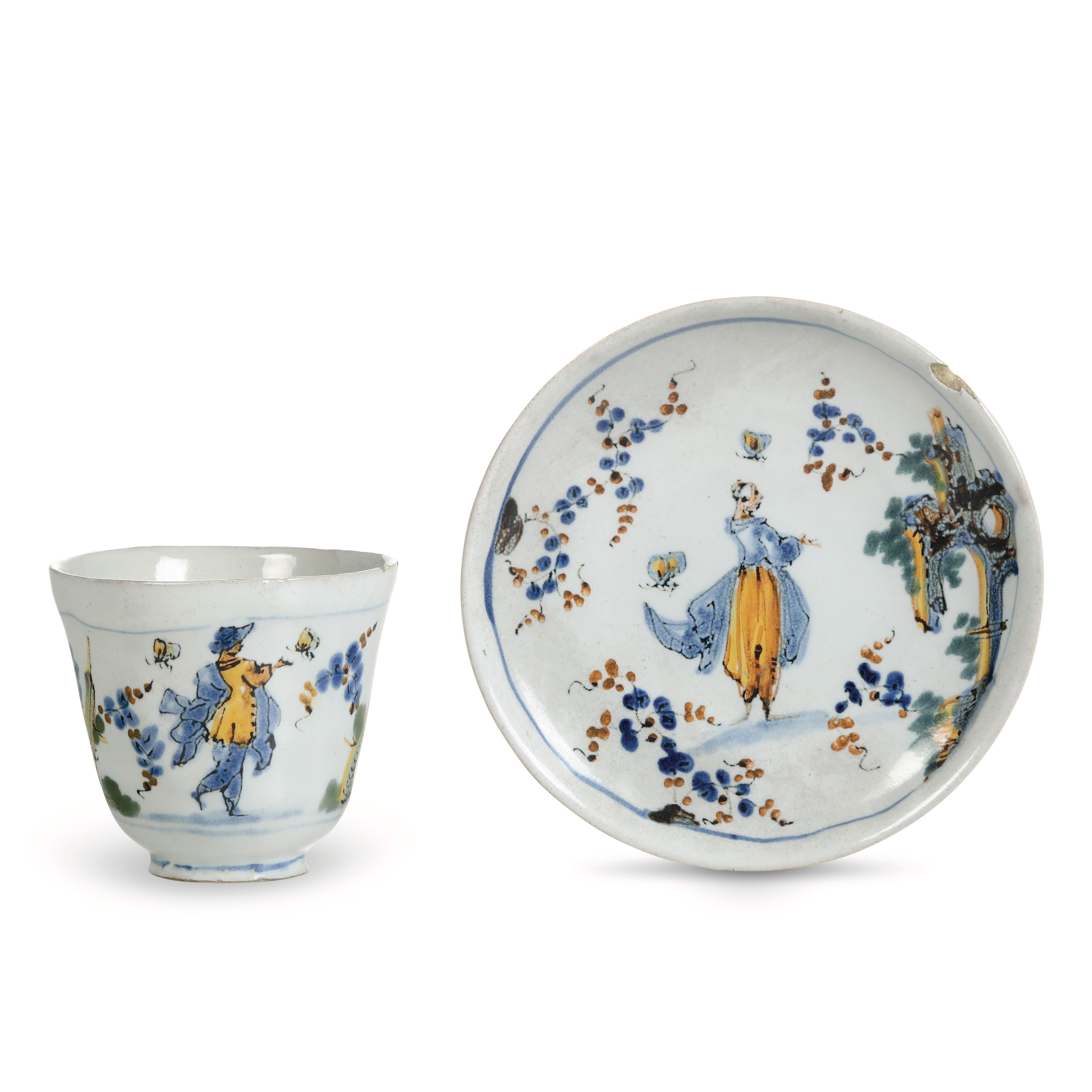 Maiolica. Marca: Stella con lettera "S" in nero. Dimensioni: altezza tazza cm 6,5; diametro piattino cm 11,9. Conservazione: tazza con sbeccature al bordo superiore restaurate e insignificante felatura; piattino con sbeccatura al bordo