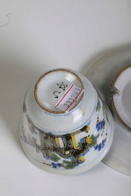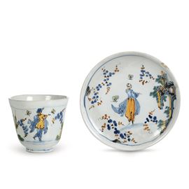 La tazza campaniforme e il piattino sono decorati in policromia a gran fuoco con “figuretti e rovine” nei colori giallo, verde, blu e manganese
