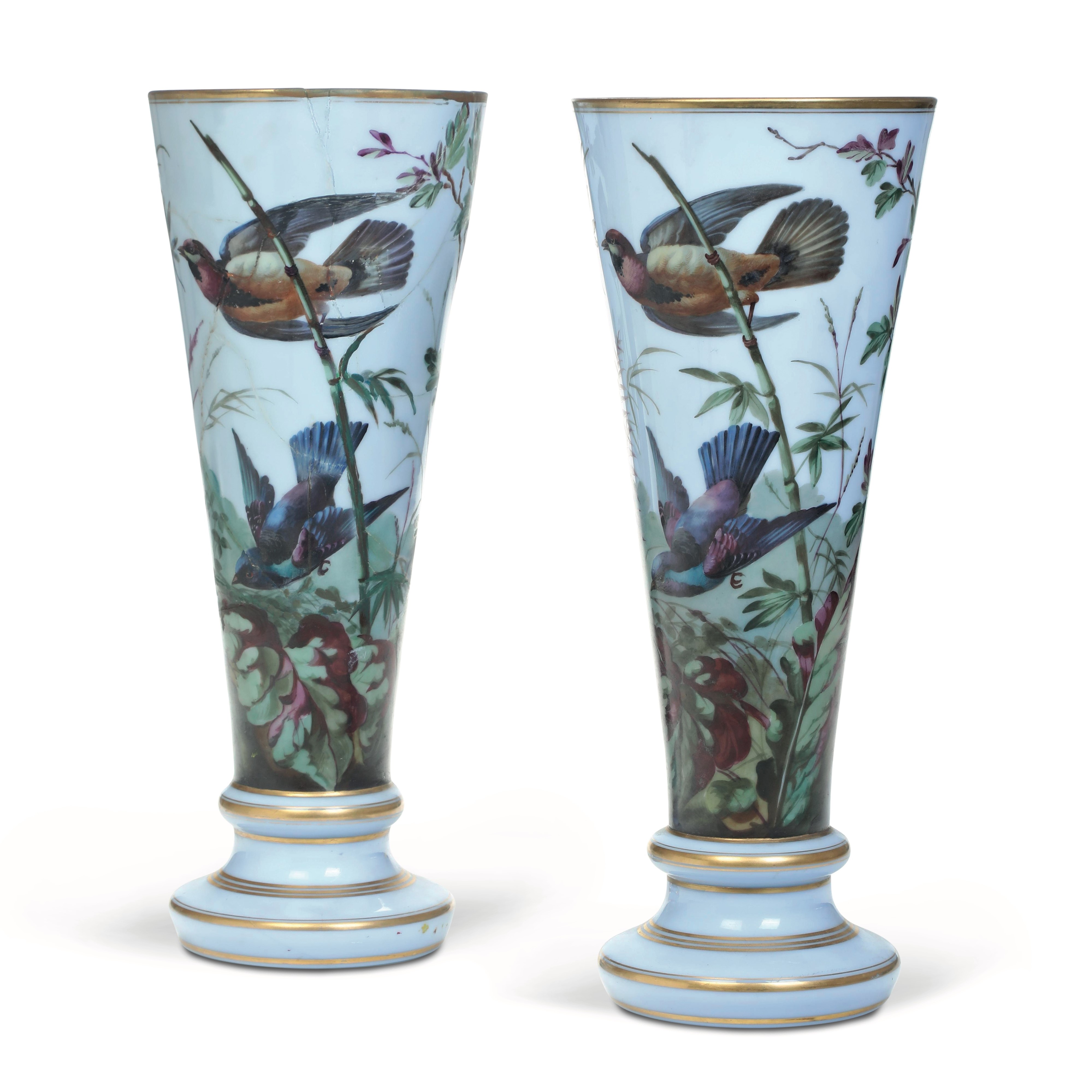 La decorazione, eseguita a mano con smalti policromi, raffigura scene naturalistiche con uccelli in volo o posati su rami fioriti, immersi in una vegetazione lussureggiante. Le filettature in oro che ornano i bordi superiori e le modanature delle basi conferiscono ulteriore preziosità all’insieme