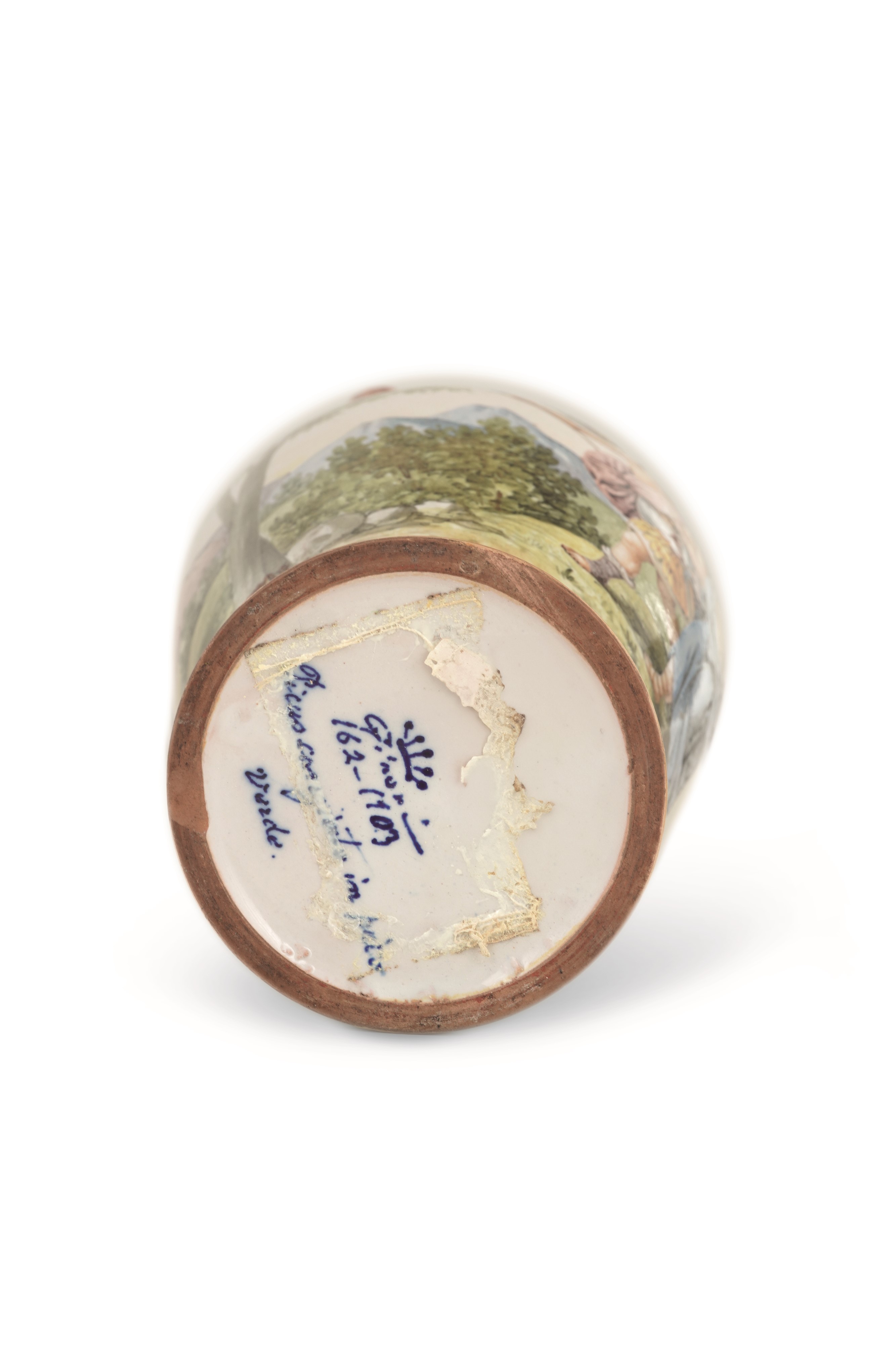 Il vaso appartiene alla produzione di “maioliche artistiche” introdotte dalla Manifattura Ginori nella seconda metà dell’Ottocento, in concomitanza alla sua partecipazione alle Esposizioni Internazionali. I numeri posti sotto al piede indicano il modello (n. 162) e il decoro (n. 1103). L’ampio intervallo tra i numeri, lascia intuire che la forma del vaso è stata realizzata intorno al 1873-1874, quindi circa un ventennio prima del decoro, databile tra il 1894 e il 1895. Un vaso simile con il numero di modello 163 e con un decoro in stile pompeiano è riprodotto in un album acquerellato della manifattura databile al 1875.
