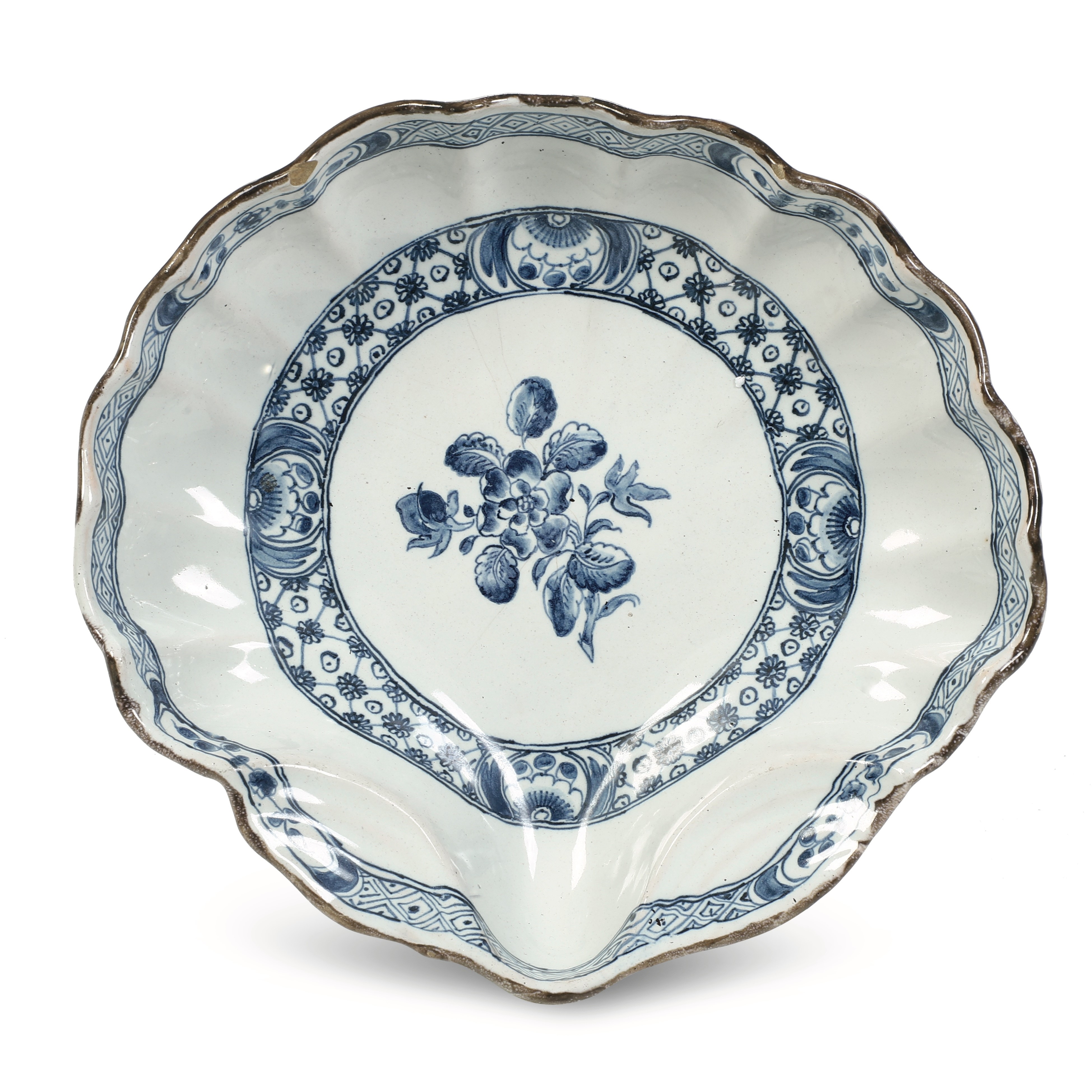 Il vassoietto, modellato a forma di valva, è dipinto a gran fuoco in monocromia blu di cobalto con il bordo filettato in bruno di manganese. Al centro, una rosa blu è incorniciata da un nastro d’ispirazione orientale con elementi geometrici alternati a fiori stilizzati. Sotto la filettatura bruna corre un altro nastro con quattro riserve a graticcio alternate a quattro con stelo fiorito