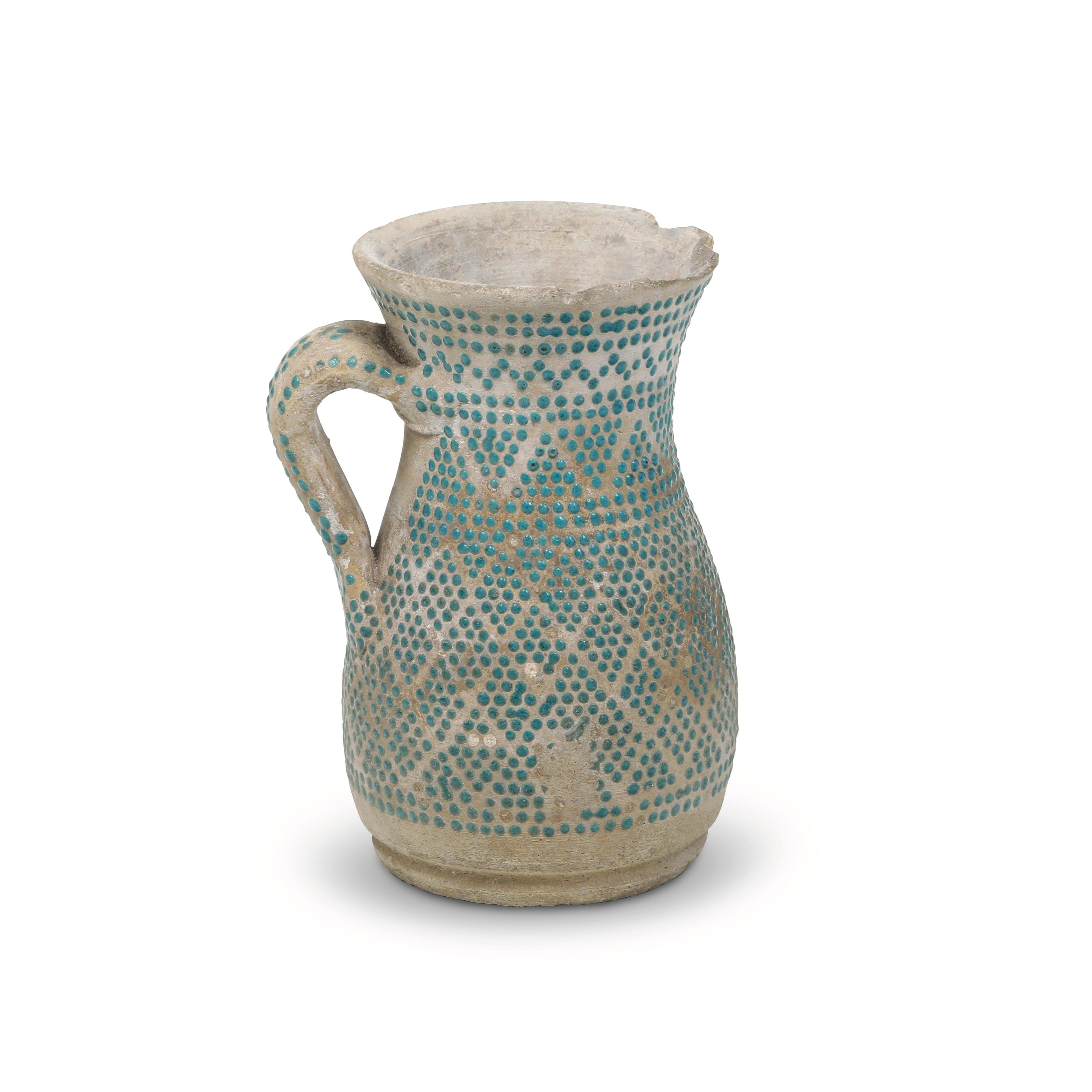 La superficie esterna del versatoio monoansato è decorata con un motivo a rombi formato da piccoli punti di vetrina turchese in rilievo