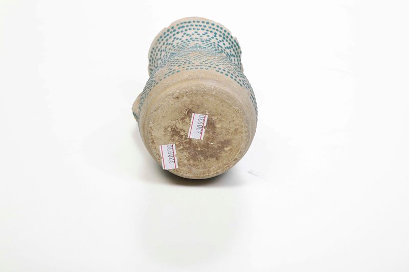Terracotta decorata a smalti turchesi. Altezza: cm 14,5. Conservazione: sbeccature al bordo superiore; qualche salto di smalto ai puntini della decorazione