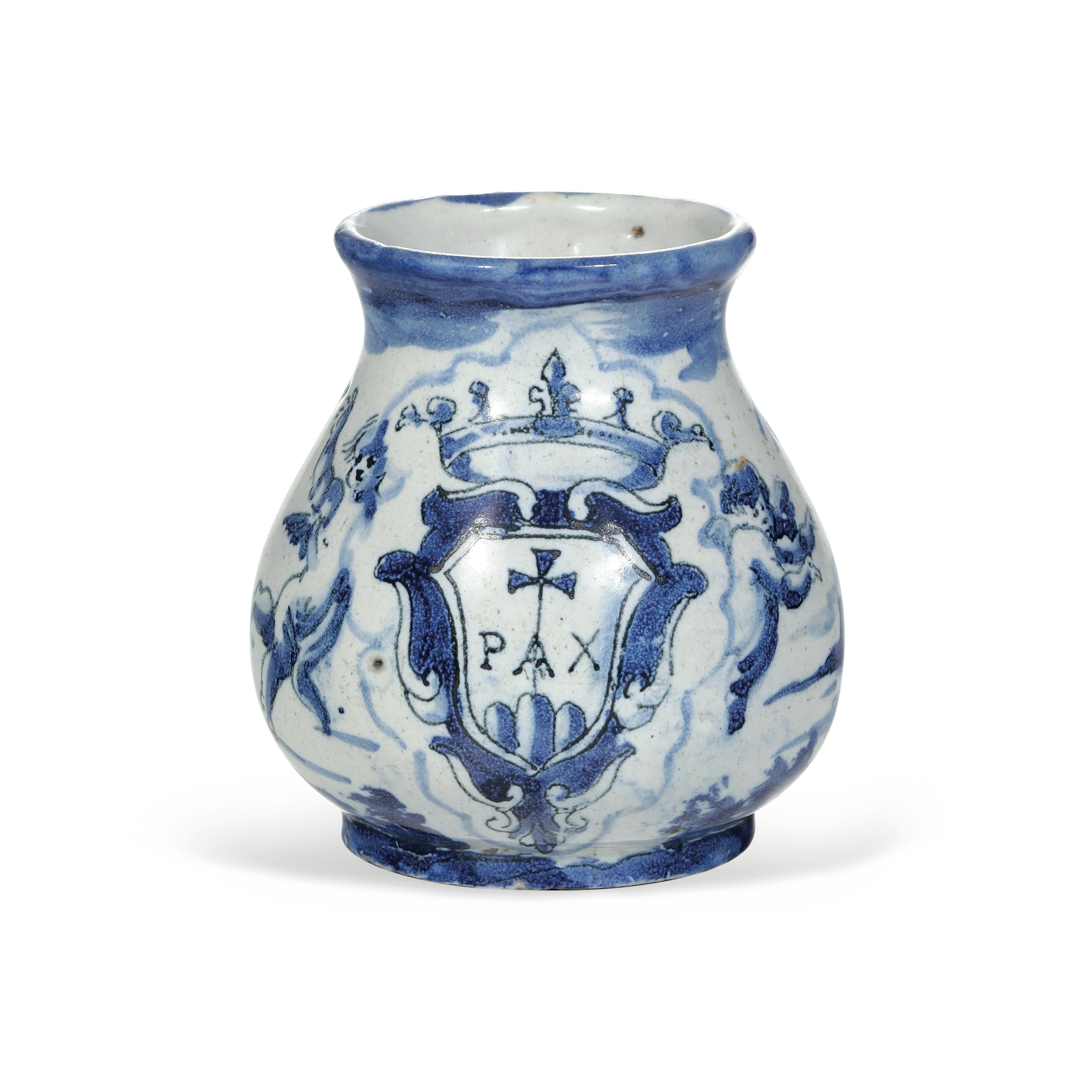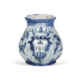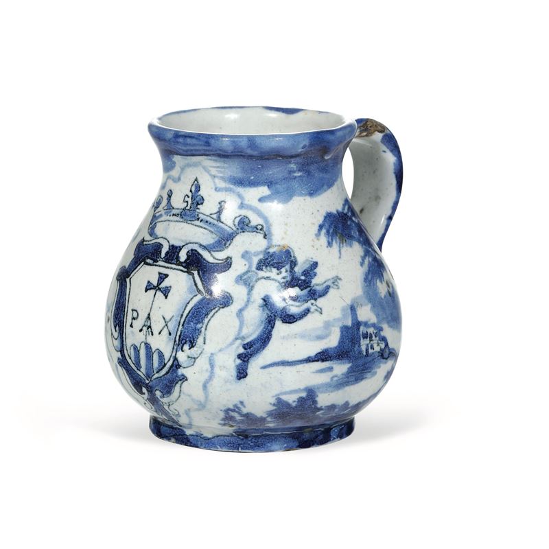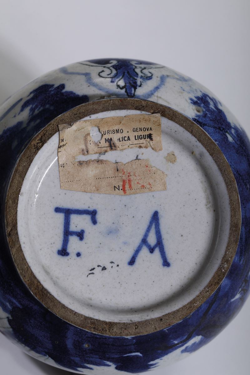 Maiolica. Marca: "F.A" in blu. Altezza cm 13. Conservazione: ottima; sbeccature e cadute di smalto al manico. Etichetta cartacea dell'Esposizione "Antica Maiolica Ligure” del 1939 a Genova