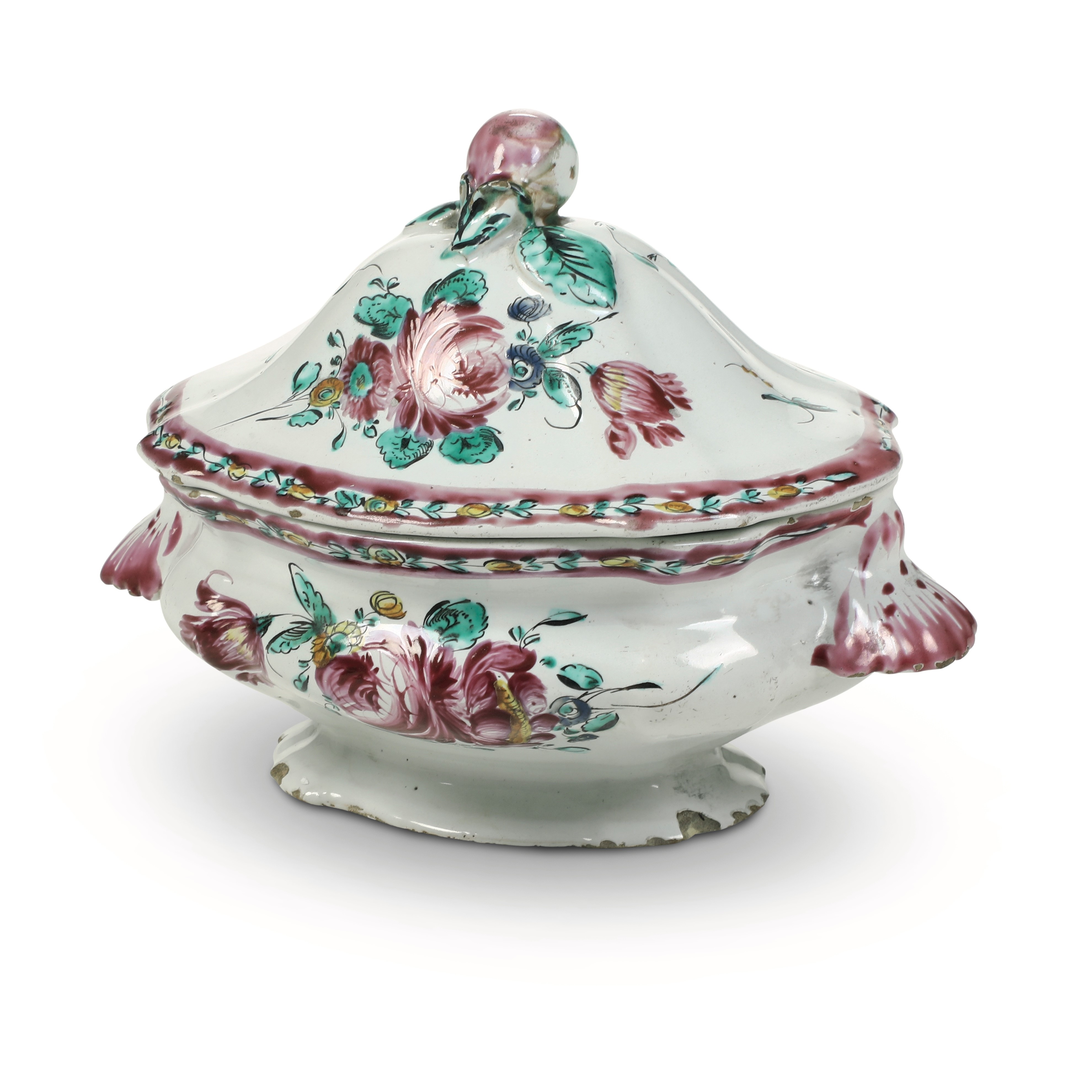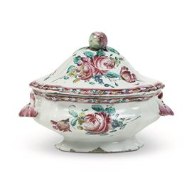La zuccheriera ha le pareti costolate e il coperchio cuspidato con presa modellata a forma di fruttino. La decorazione pittorica, in forte policromia a piccolo fuoco, é eseguita con il motivo decorativo chiamato “alla rosa” che presenta grandi fiori recisi con foglie disegnate in nero e colorati in verde, porpora, giallo e blu. Al bordo un nastro rosso porpora è percorso da uno stelo fiorito e fogliato