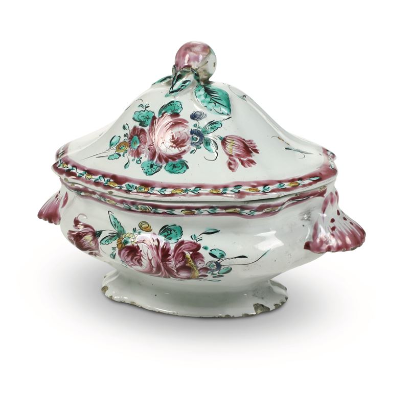Maiolica decorata a piccolo fuoco. Marca: assente. Dimensioni: altezza cm 13,5; cm 18,5x12,8. Conservazione: piccola felatura al bordo superiore; sbeccatura al bordo della base; insignificanti salti di smalto