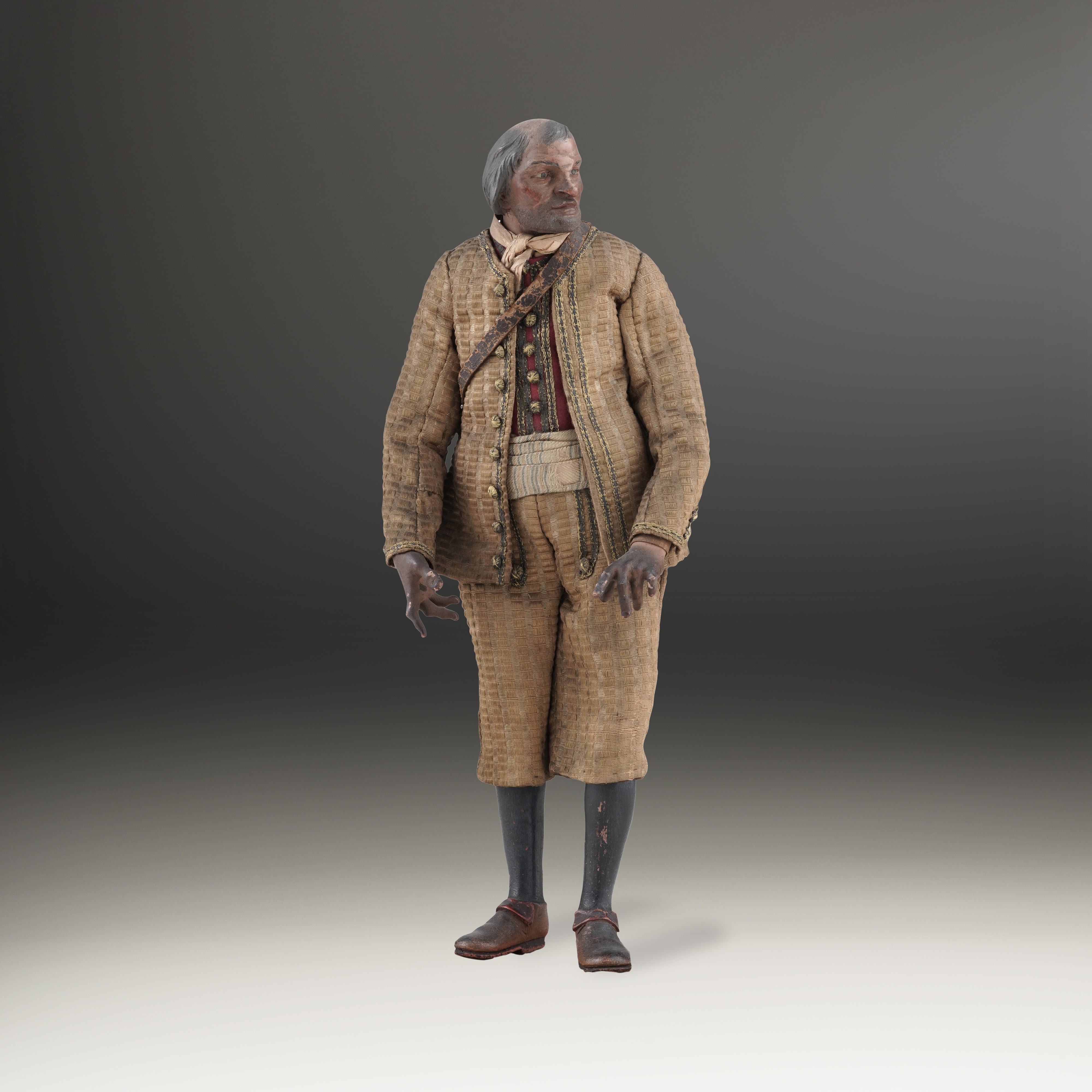 Figura da presepe con mani e testa in terracotta, occhi di vetro, abiti in tessuto.