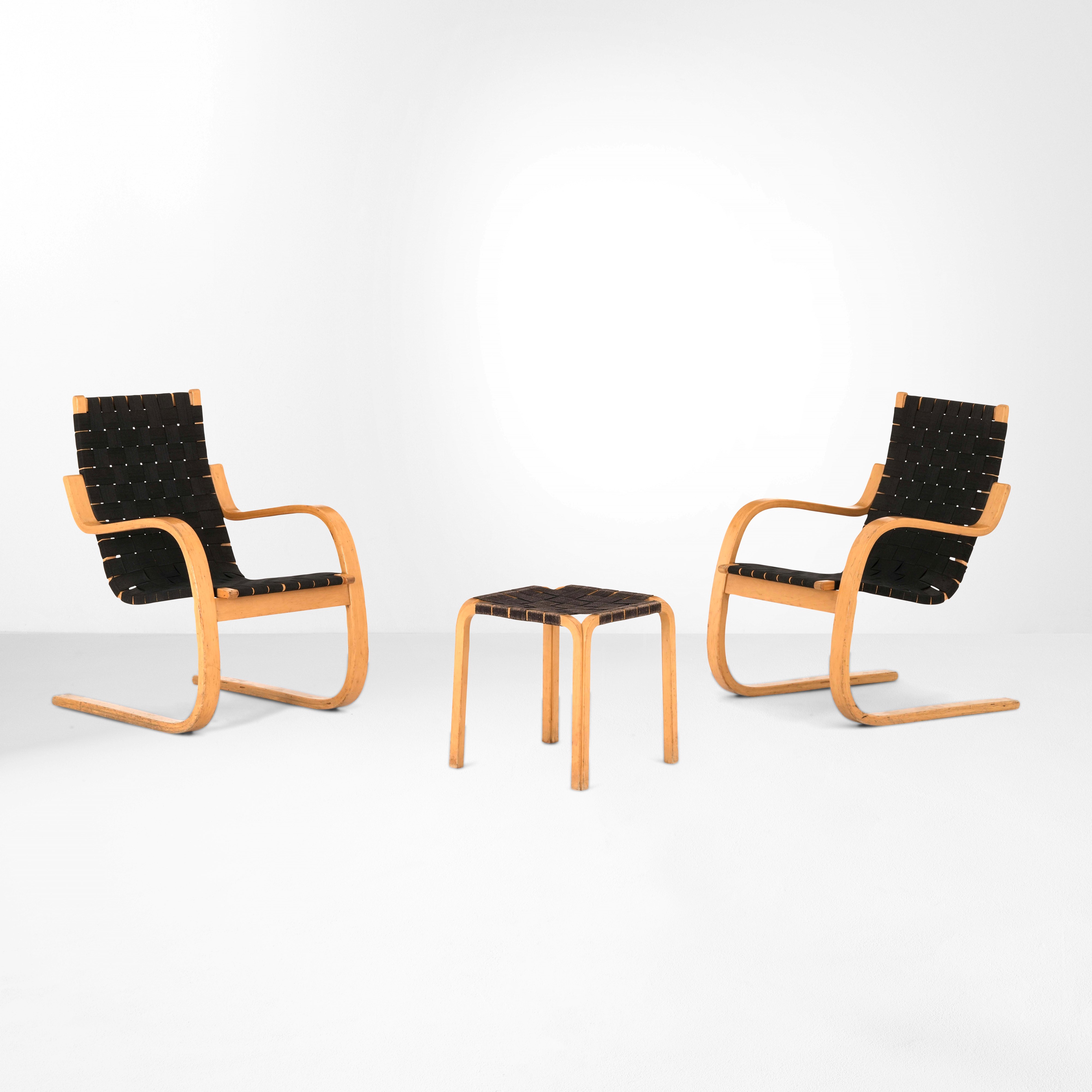 Struttura in legno curvato e seduta in tessuto intrecciato.