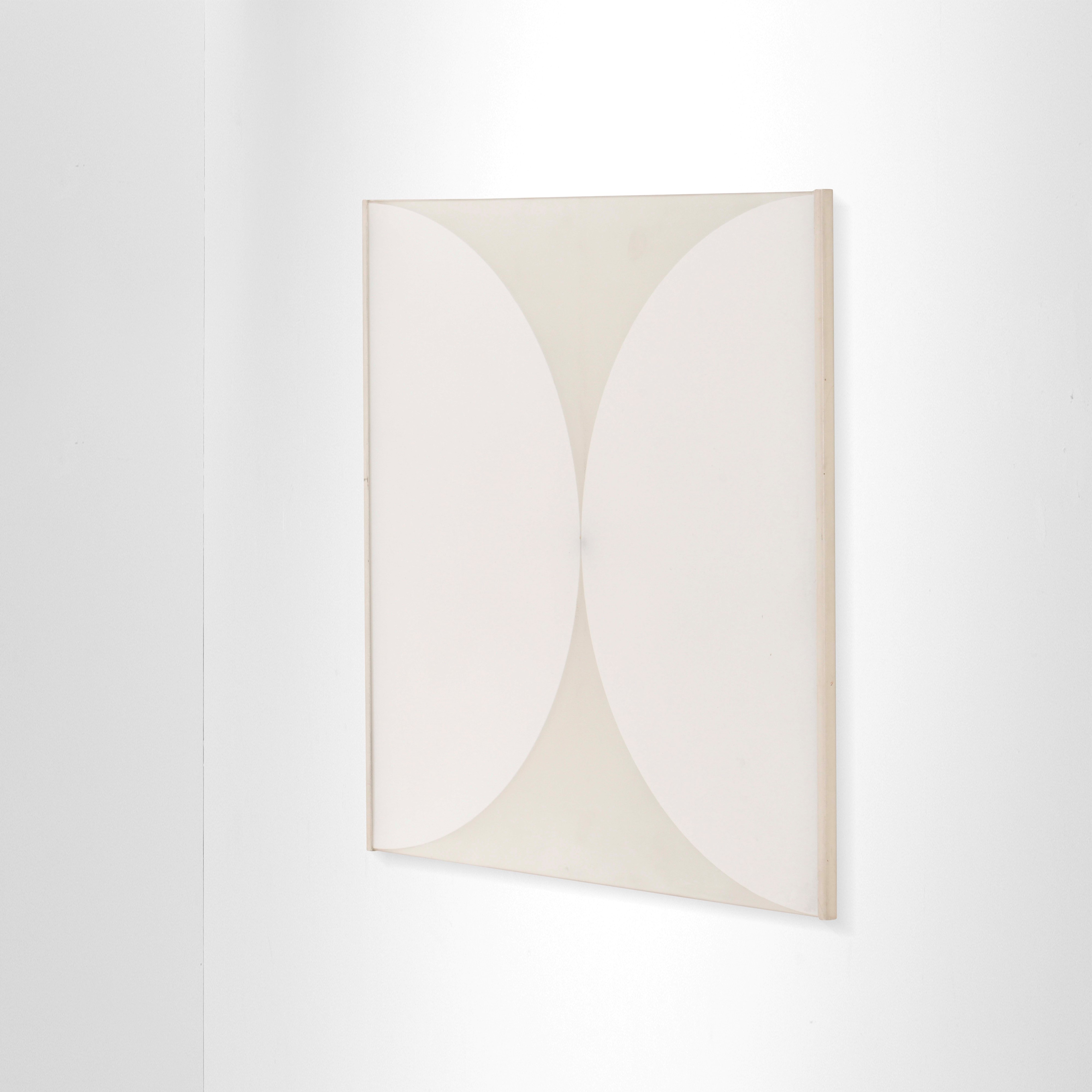 Struttura in metallo smaltato e laccato con diffusore in vetro.