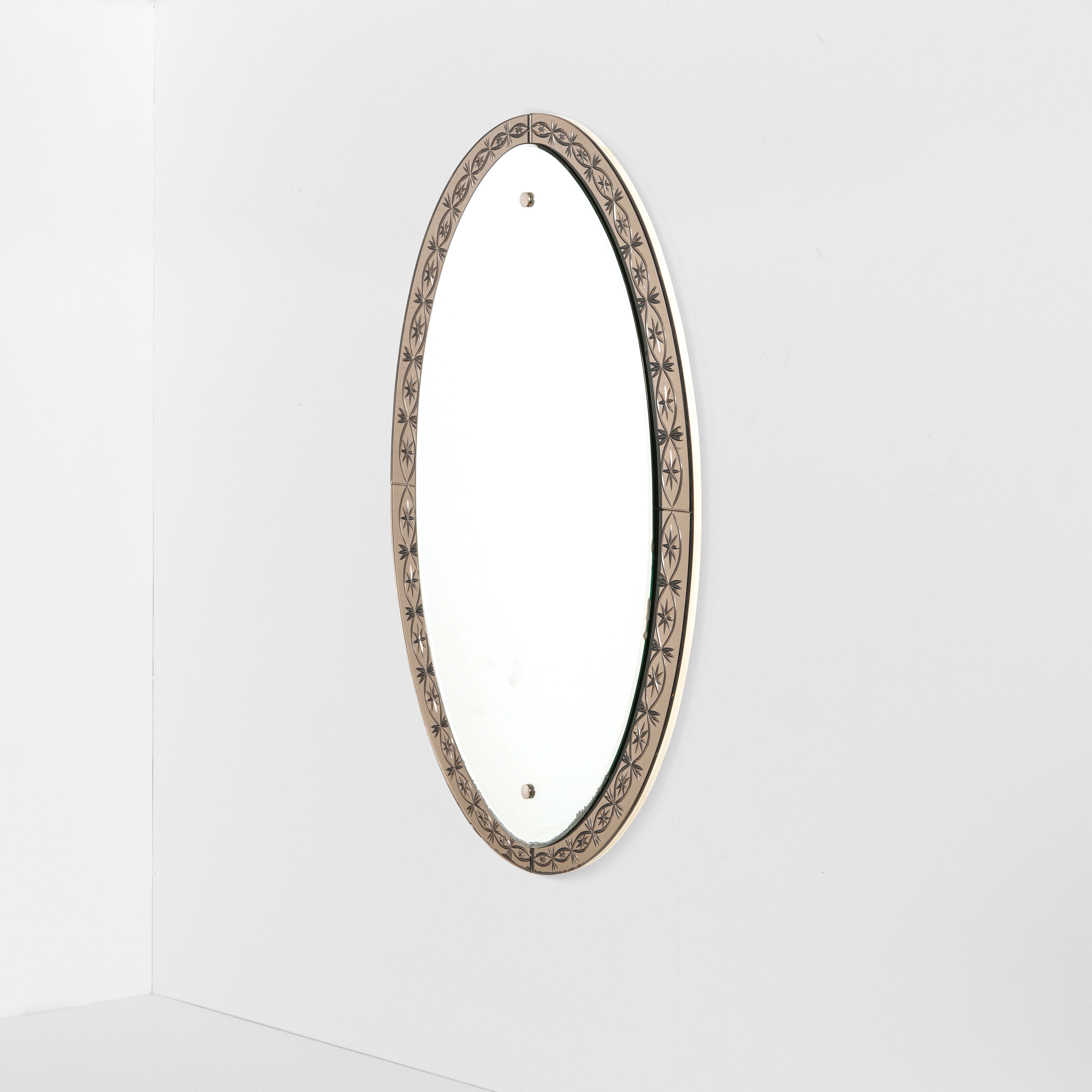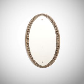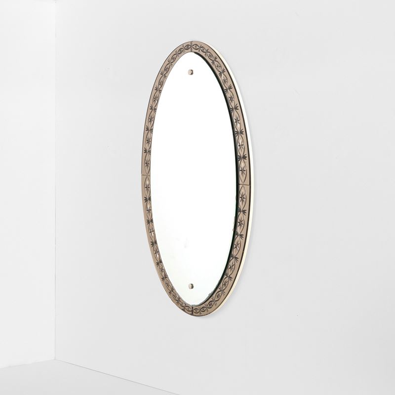 Struttura in legno, cornice in vetro colorato e dettagli in metallo.