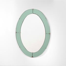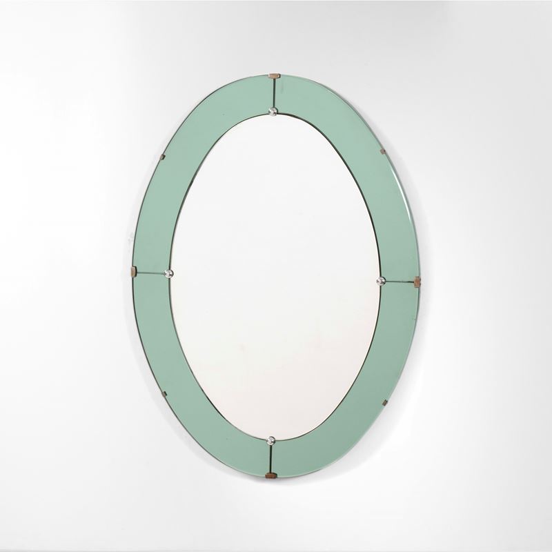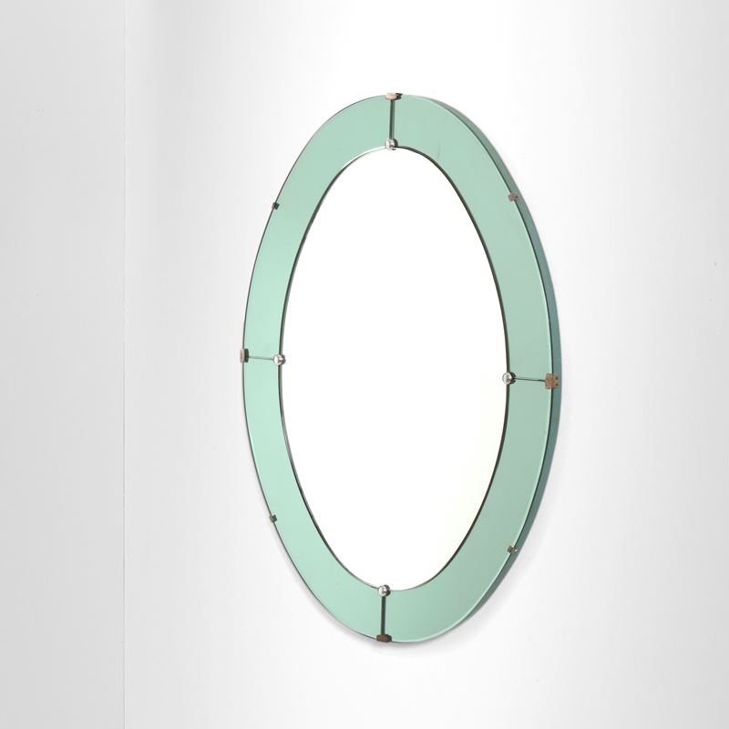 Struttura in legno, cornice in cristallo molato e colorato con dettagli in metallo cromato.