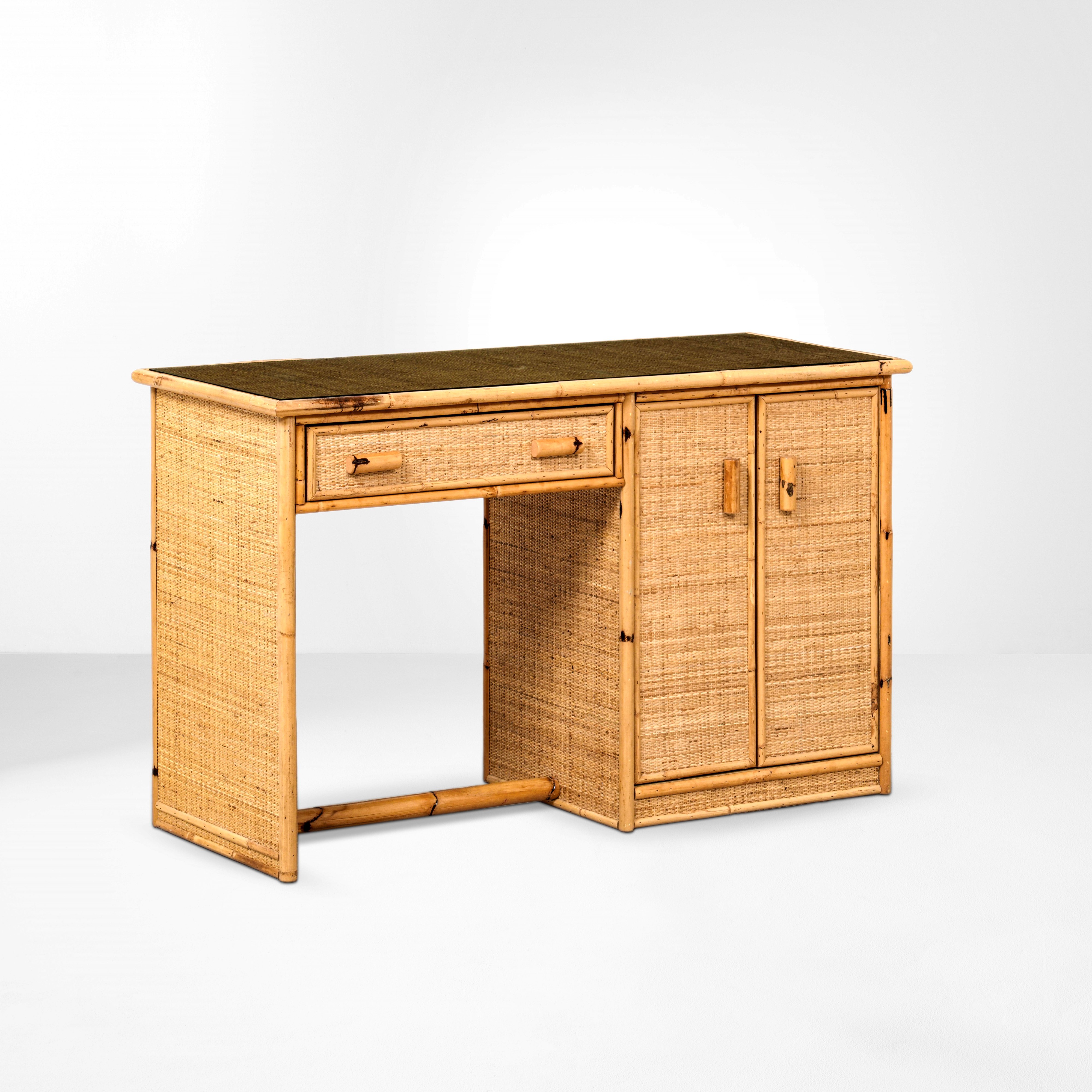 Struttura legno, bambù e vimini. Piano in vetro.