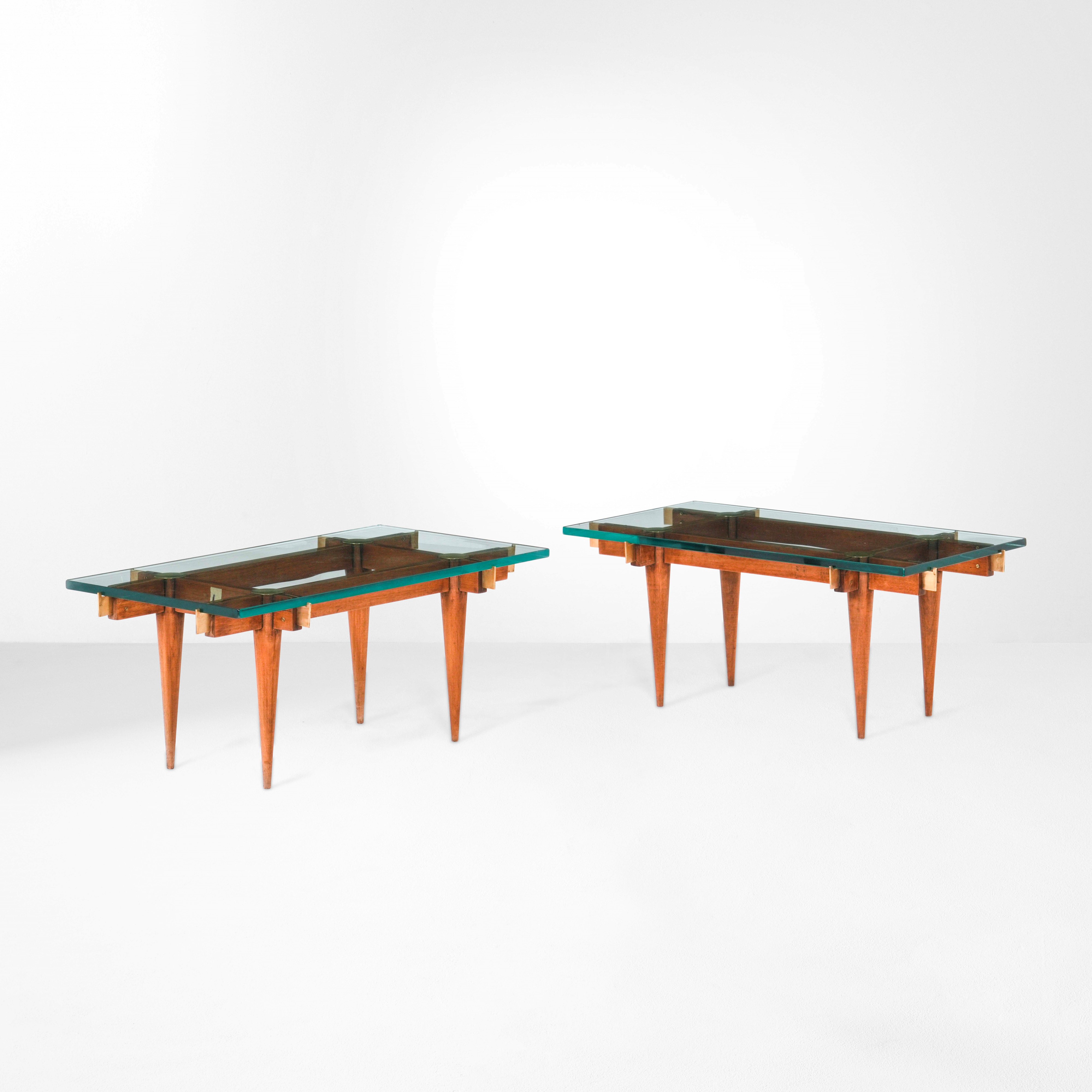 Struttura in legno, piani in cristallo molato e dettagli in ottone.