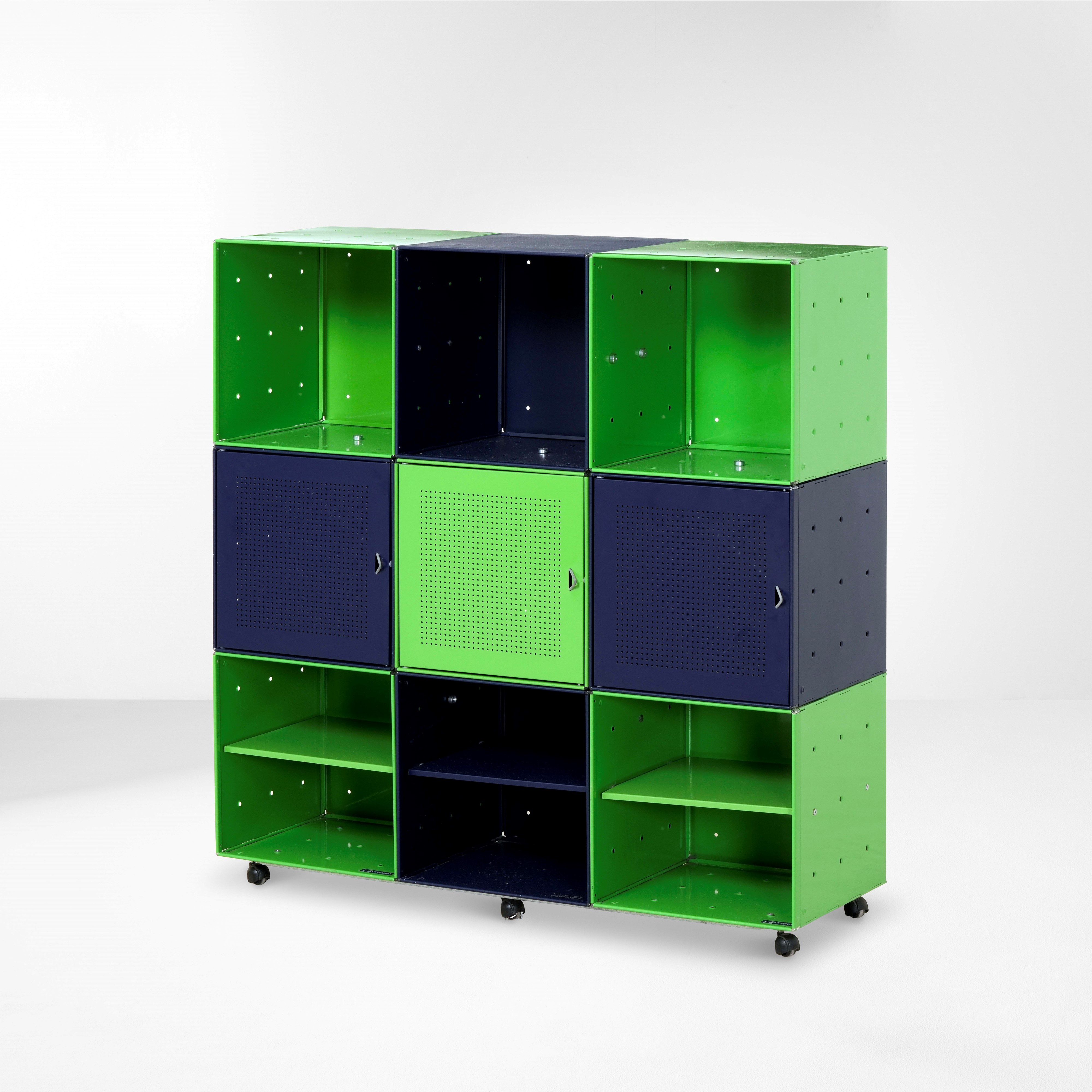 Struttura in metallo laccato e perforato. Ruote in materiale plastico.