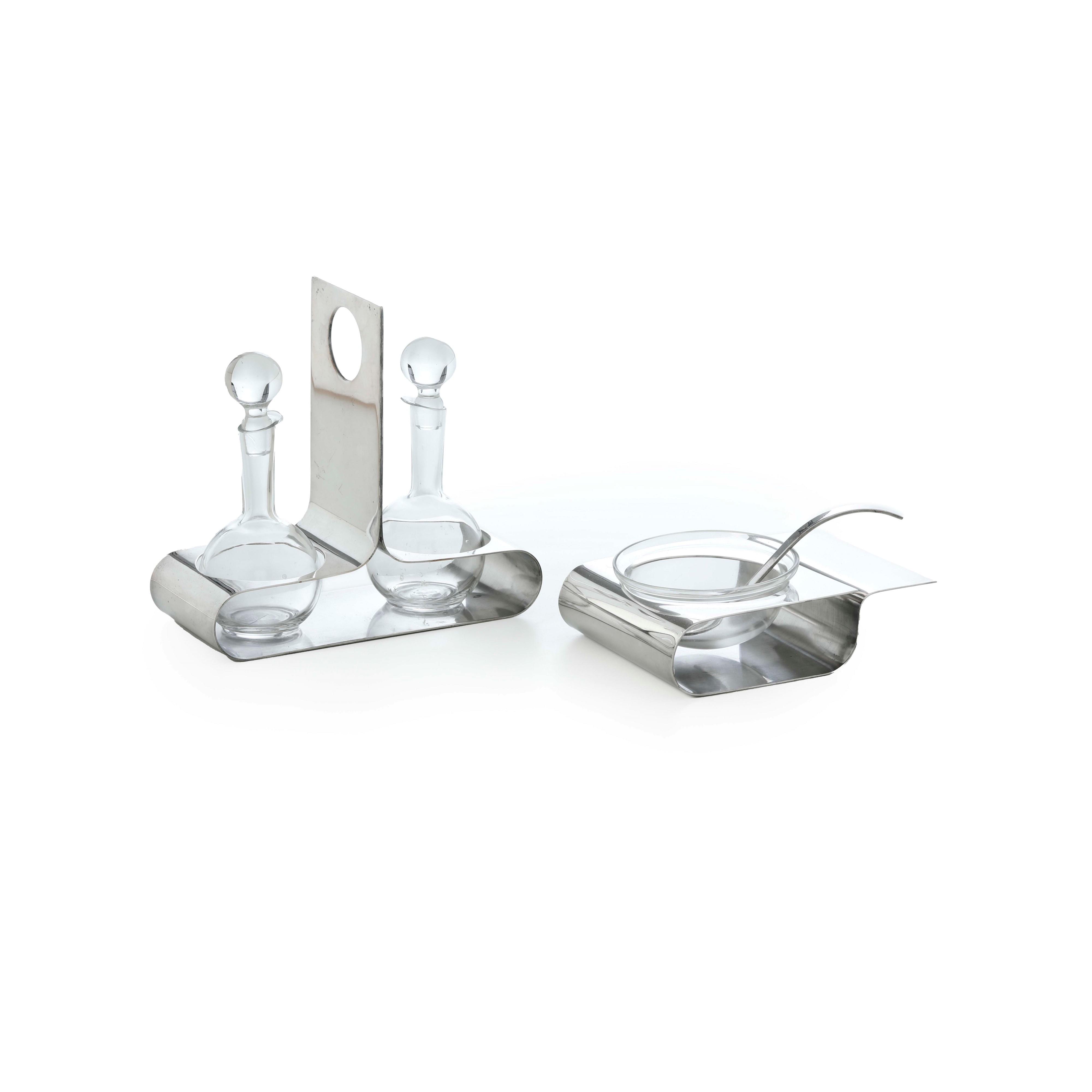 Supporto e mestolino in metallo argentato, vaschetta e ampolle in vetro.