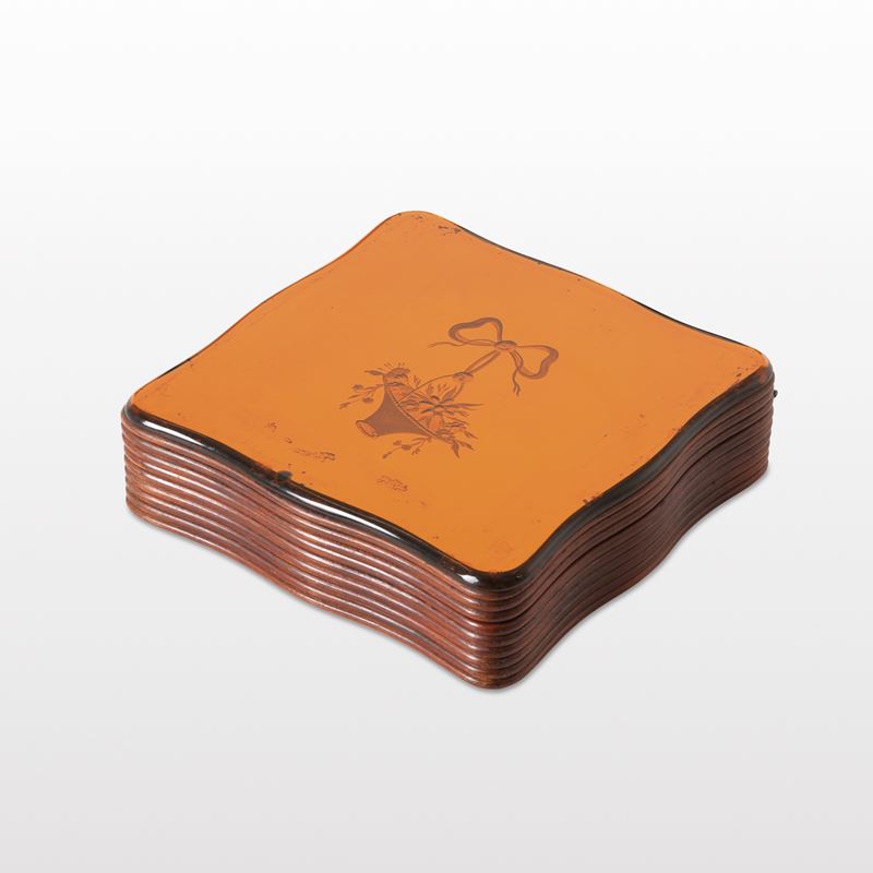 Struttura in legno sagomato con fianchi a coste. Coperchio in cristallo molato retrodipinto e inciso.
