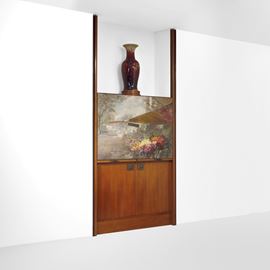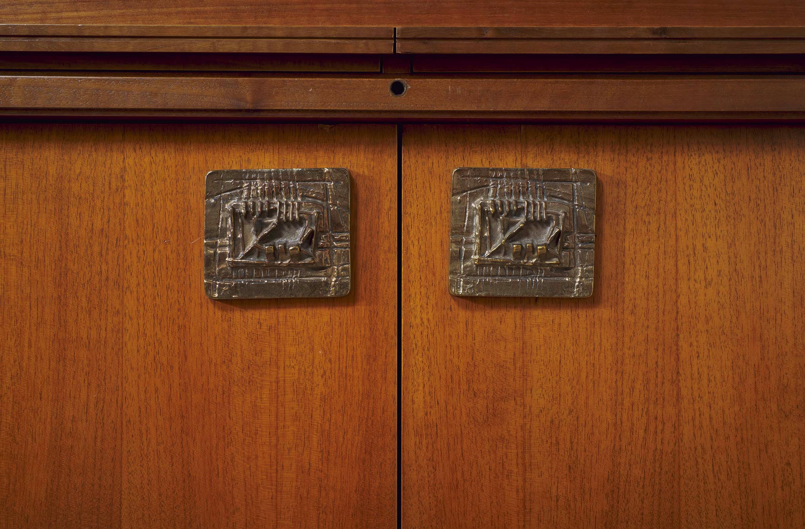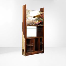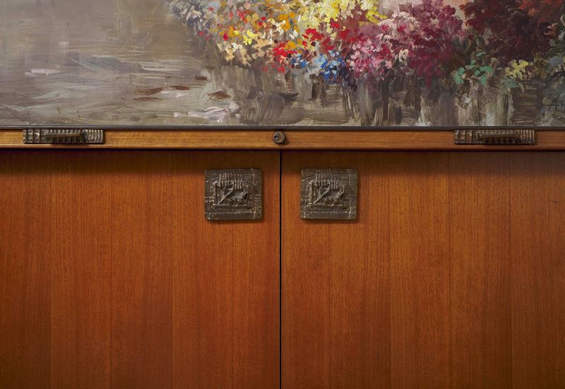 Struttura in legno e legno impiallacciato. Ante a decoro dipinto firmato Attilio Melo. Maniglie e dettagli in bronzo lavorato ad opera di Arnaldo Pomodoro. Interni in ottone e cristallo molato.