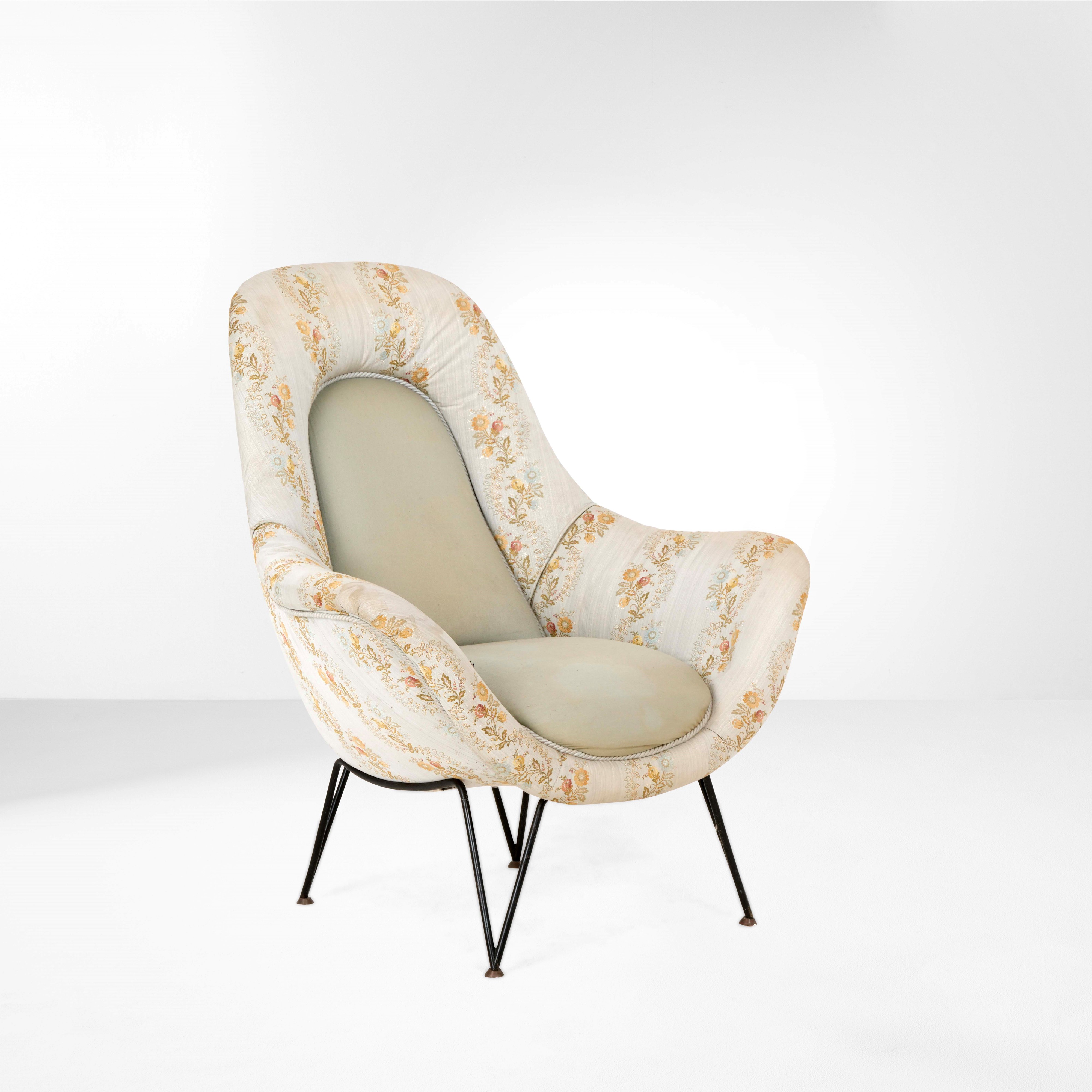 Struttura in legno, sostegni in metallo tubolare laccato e rivestimento in tessuto.