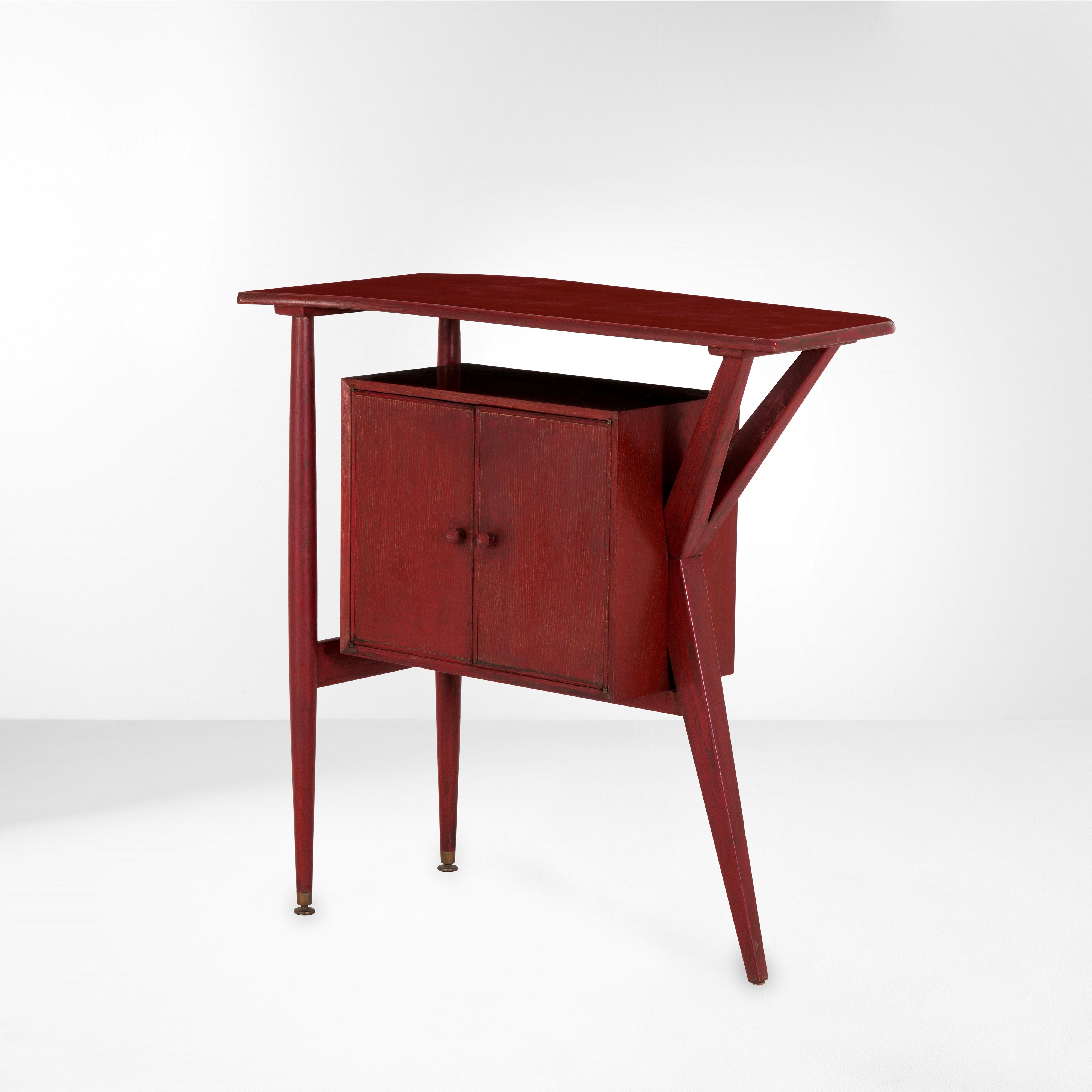 Struttura in legno laccato e piano in laminato. Puntagli in ottone.