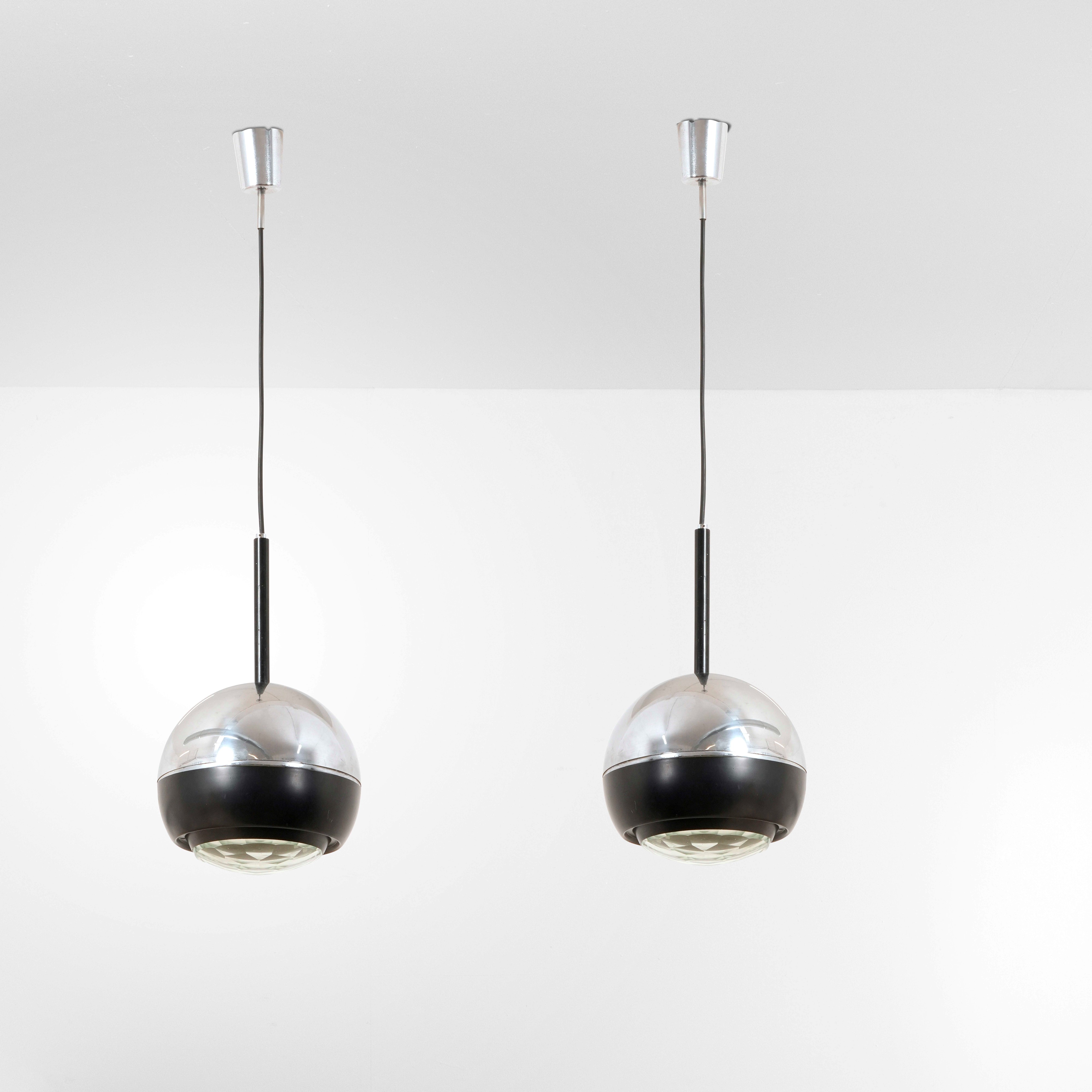 Struttura in ottone cromato, metallo verniciato e diffusore in vetro stampato.
