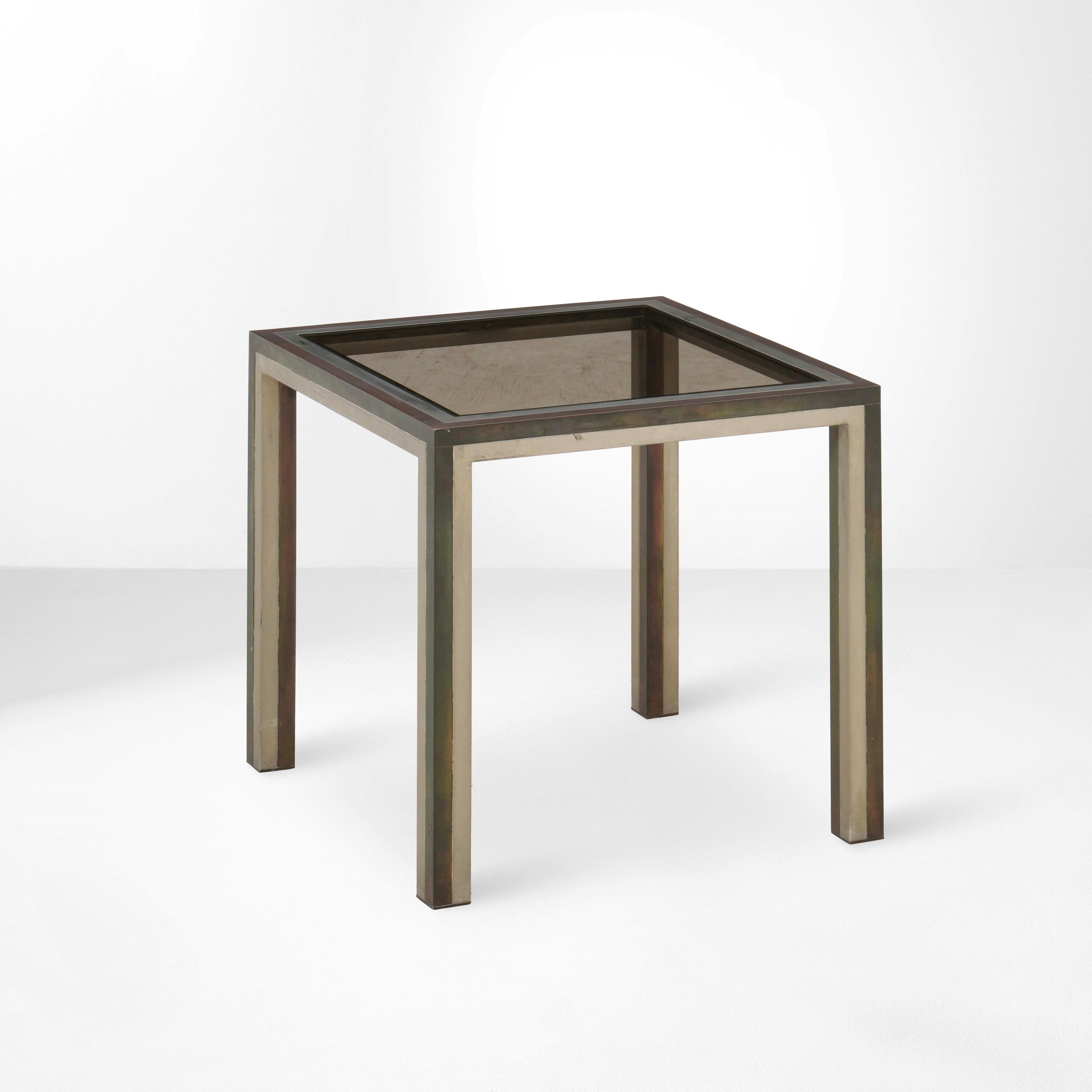 Struttura e sostegni in metallo con piano in vetro fumé.