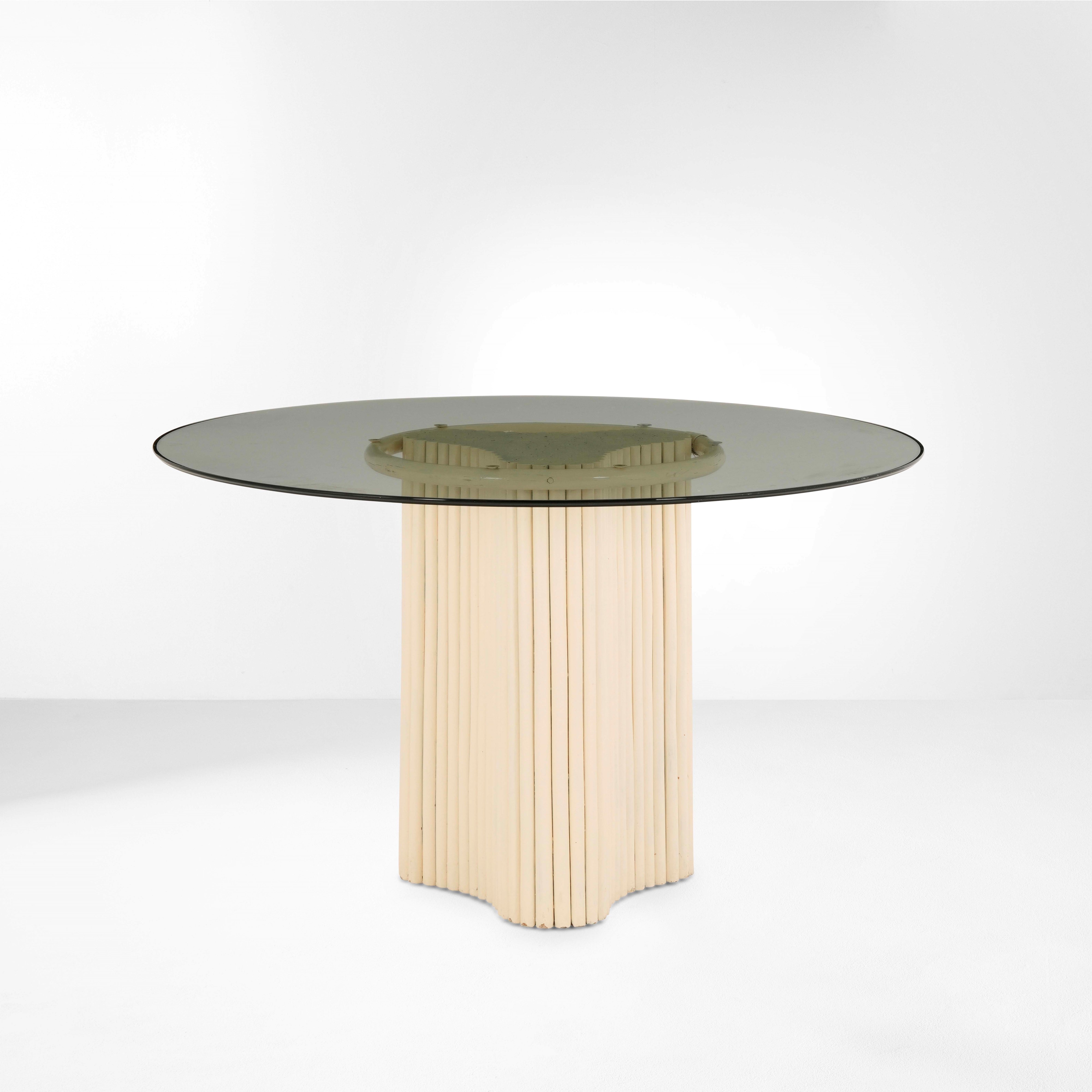 Sostegni in bambù e vimini laccati con piano in vetro.