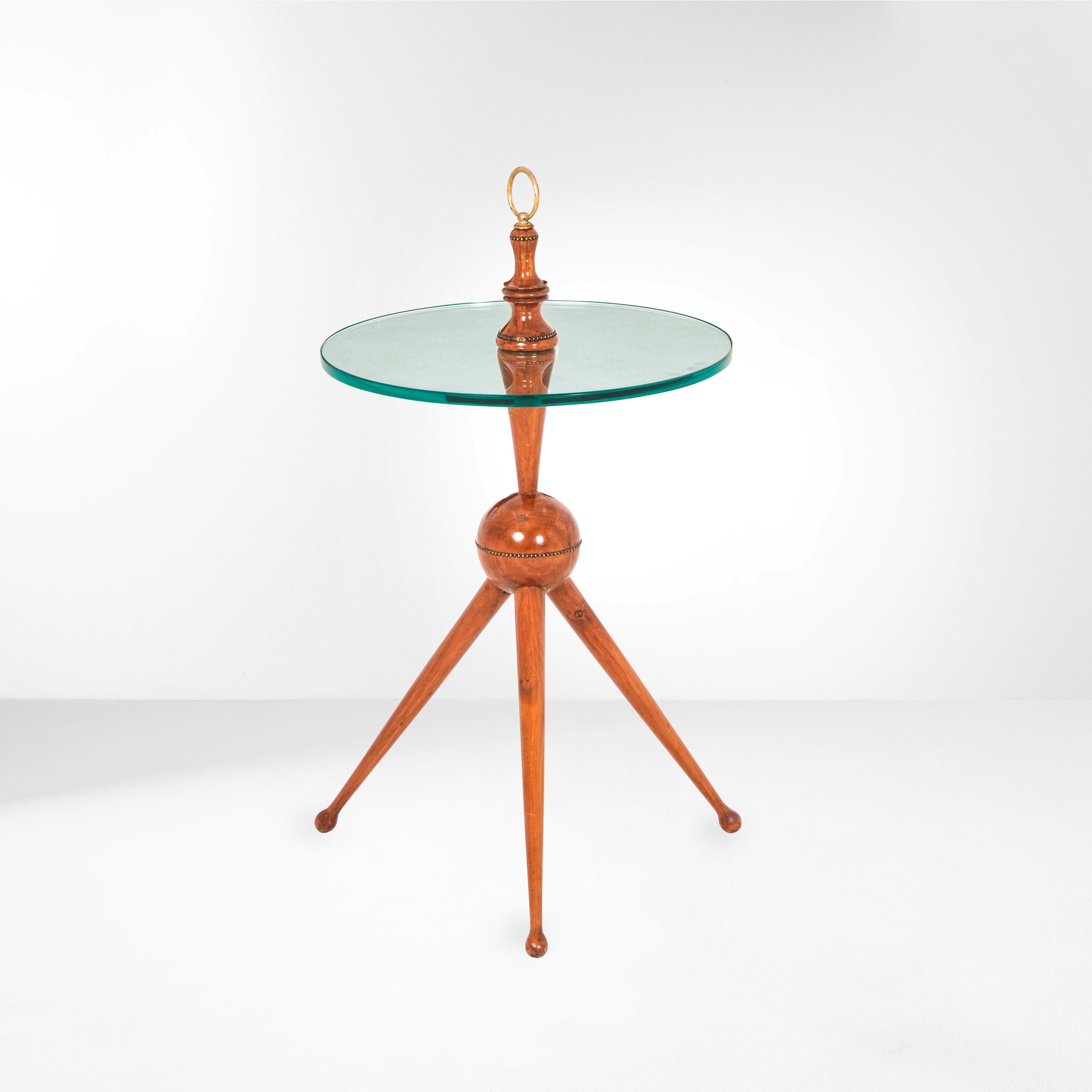 Struttura in legno con piano in cristallo molato e dettagli in ottone.