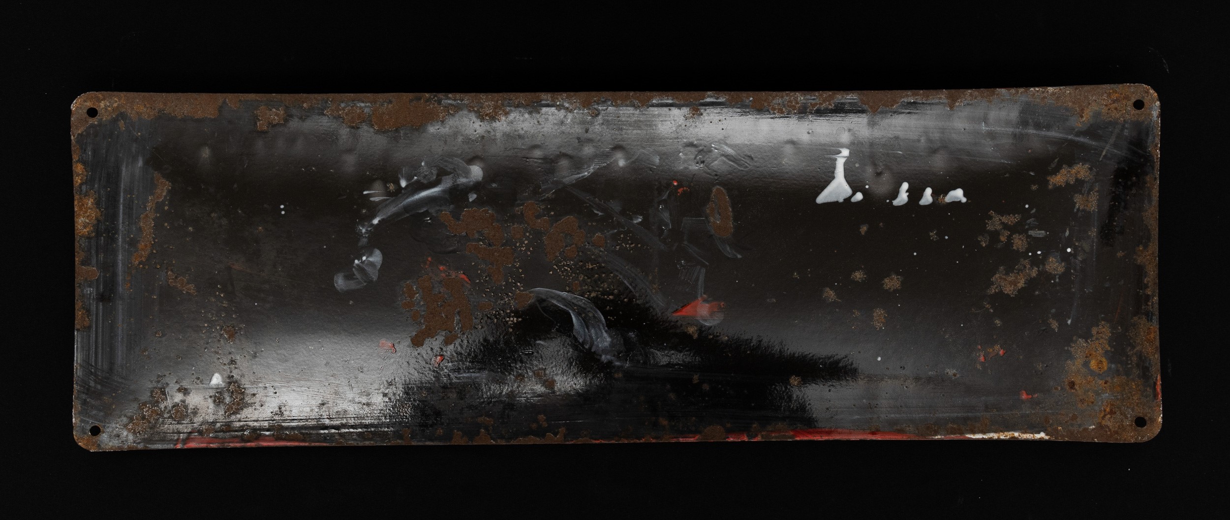 Insegna smaltata su metallo, 1930 ca. Cm 59 x 21. Segni del tempo.