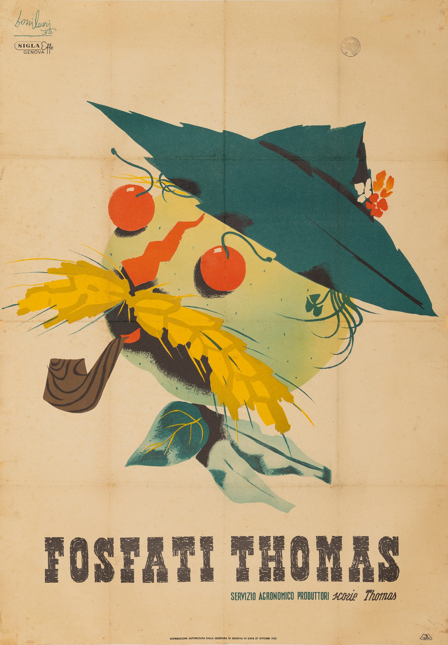 Affisso litografico, 1952. Impresso da Sigla - Effe - Genova. Cm 100 x 70. Telato. Qualità B.