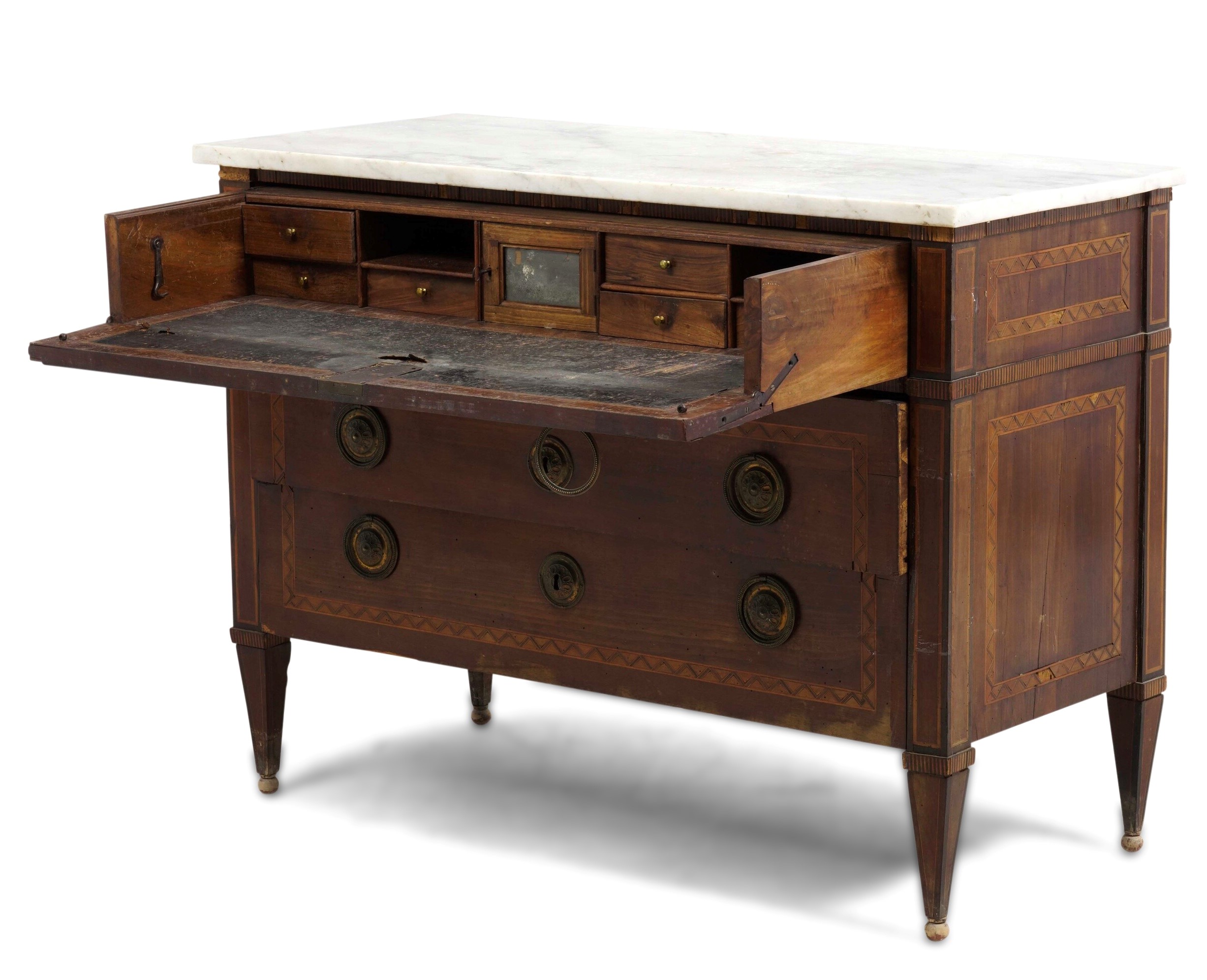 Fronte a due cassetti e scarabattolo che cela piano per scrivere, cassettini e scomparti, piano in marmo, gambe rastremate (difetti)